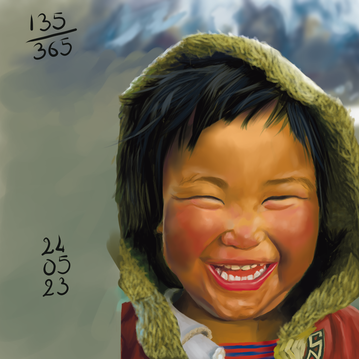Et bien sûr, la référence de mercredi était elle aussi bien compliquée! Cette capuche!! Ces joues!! Bref, j’ai tenté l’expérience et je suis plutôt contente de ce que j’ai réussi à faire! Par contre, je n’avais plus d’énergie à la fin de la journée. J’ai payé le prix de faire deux portraits aussi complexes dans la même journée. J’ai donc réagi et je me suis rappelée de prendre soin de moi….