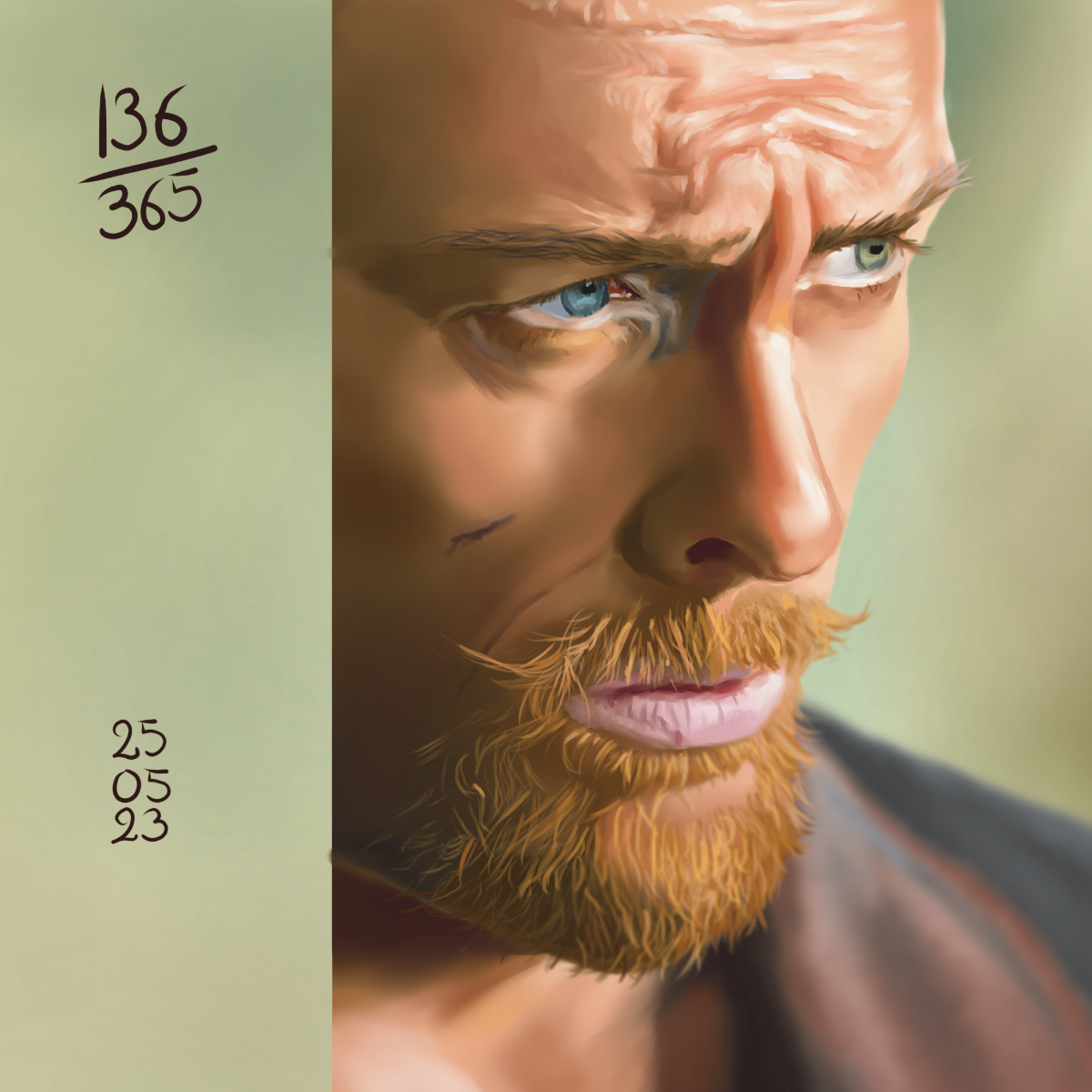 La référence de jeudi ne m’inspirait pas du tout. Du coup, j’ai pioché dans mon dossier de refs en attente. Et j’ai choisi cette référence. Pas si simple, mais pas trop complexe non plus. Je vous ai dit que je n’avais plus peur des poils ou des rides? hahaha. La couleur de sa bouche me paraissait vraiment étrange, et je me suis souvenue que la ref était issue de la série Black Sails (je la recommande, un bijou) et que le personnage souffrait de déshydratation. Ok, soit… bref, super contente de mon rendu, et me voial remotivée!