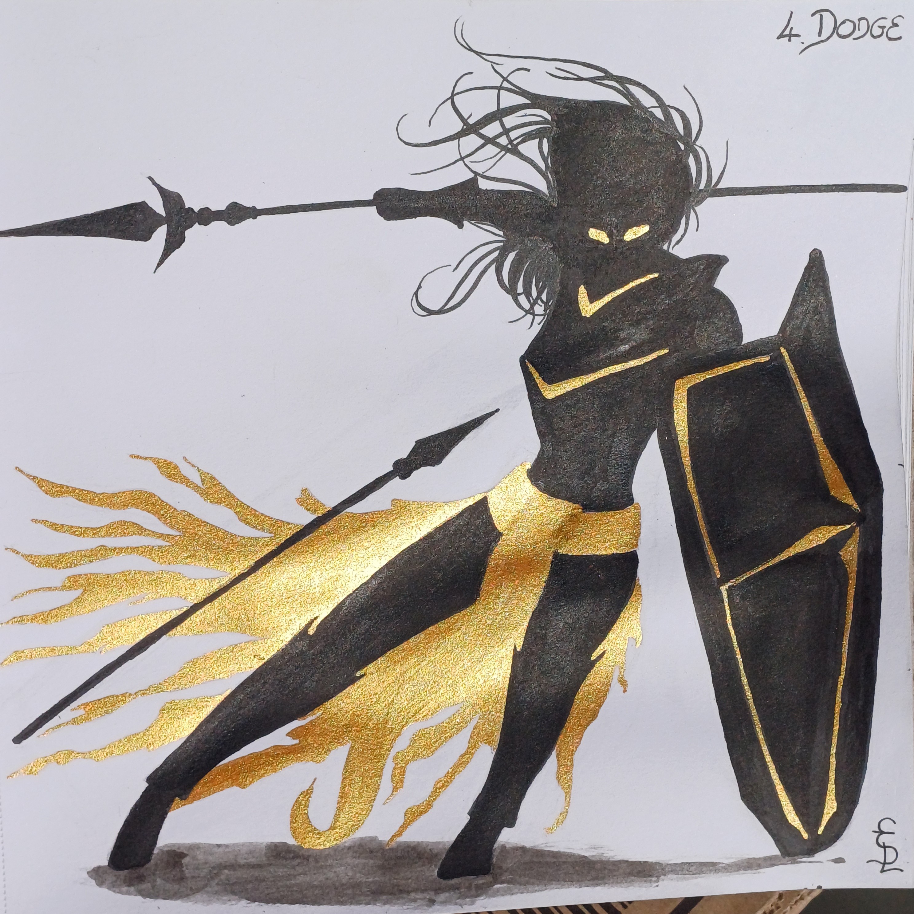 Après le dessin d’hier, j’ai opté pour faire simple aujourd’hui. Et j’ai trouvé une référence parfaite pour ça, donc pour une fois, j’ai fait un personnage… enfin, une sorte de personnage. Je ne suis pas du tout au point pour le faire d’imagination, il faut dire. Mais c’est quelque chose que je vais surement travailler dans le futur, parce que ça ouvre le champ des possibles. Je suis super contente du résultat, même si la photo ne lui rend pas justice. J’ai du faire un choix entre rendre l’effet de l’encre dorée ou celui de l’intensité du noir… J’ai opté pour le doré hahaha.