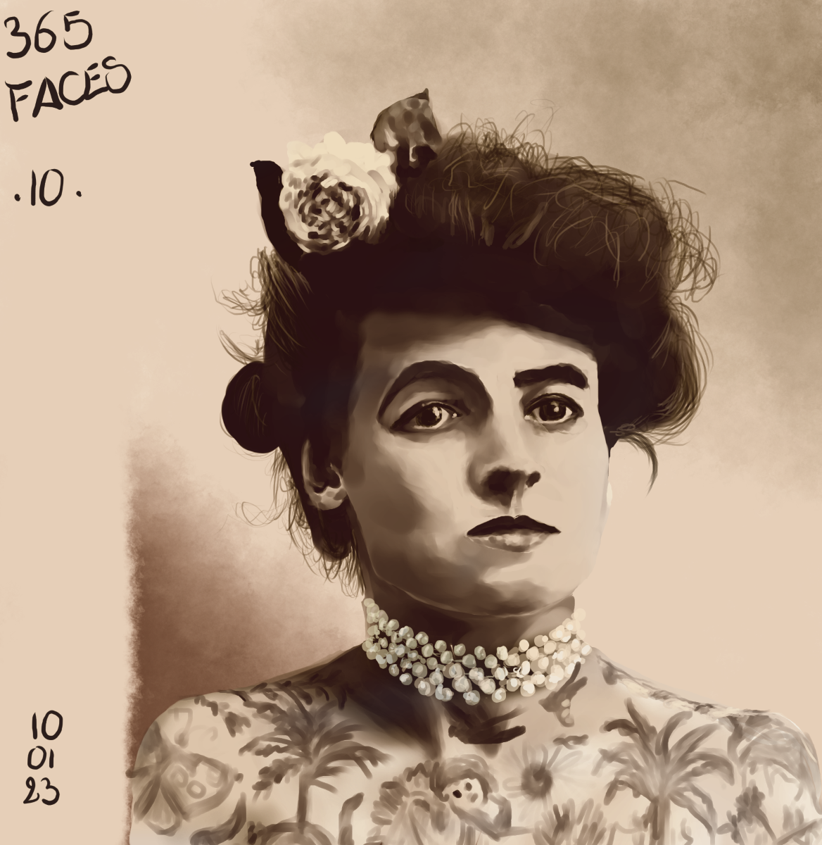 Cette référence était une photo en sépia… j’ai donc décidé de n’utiliser que deux couleurs, en jouant avec les paramètres des brushes… pas le plus simple, mais je suis super contente du résultat (et oui, j’ai simplifié +++ les tatouages, pas envie d’y passer une autre heure, au moins hahaha).