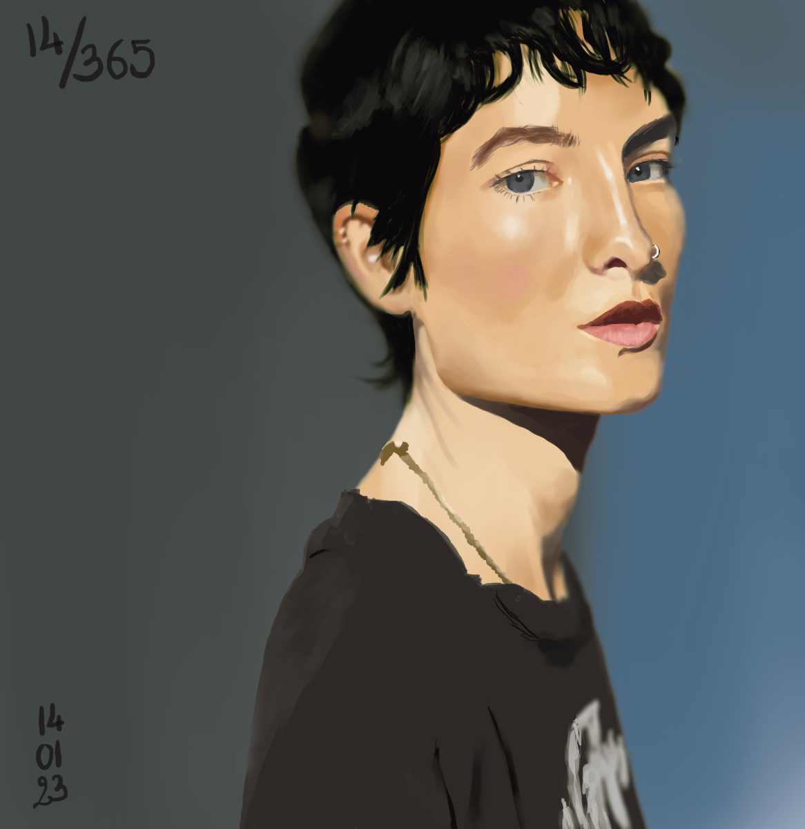 En parlant de contrainte… J’avais envie de me lancer dans le portrait, j’avais même constitué un petit dossier avec des photos qui me paraissaient intéressantes à étudier… mais manque de motivation, je ne me suis jamais lancée… Et voila que sur le discord de mon cours de peinture digitale, quelqu’un propose ce challenge au long cours (oui, je sais, je ne me lance pas dans ce genre de truc d’habitude…. mais hé! Je sors de ma zone de confort, j’ai dit!!). Un portrait par jour à partir d’une photo. Une étude, en 1h maximum. Et plusieurs d’entre nous l’ont rejoint… du coup, nous partons des même photos de référence, nous postons nos résultats, nous nous encourageons… une belle expérience! Peu importe les ratés, nous aurons l’occasion de nous rattraper au cours des études suivantes. Bon, je pars de rien, du coup les premiers ne sont pas du tout ressemblants, mais je commence à comprendre comment ça fonctionne. Mon but maintenant est de parvenir à trouver les bonnes nuances de couleurs ou de valeurs, et de corriger mon défaut de faire mes visages toujours trop larges… ça commence à venir. J’ai aussi trouvé les outils qui me conviennent pour réaliser ces portraits, et je parviens à aller un petit peu plus loin chaque jour. Voici donc ma galerie de portraits pour cette première semaine et ce qu’ils m’ont appris.