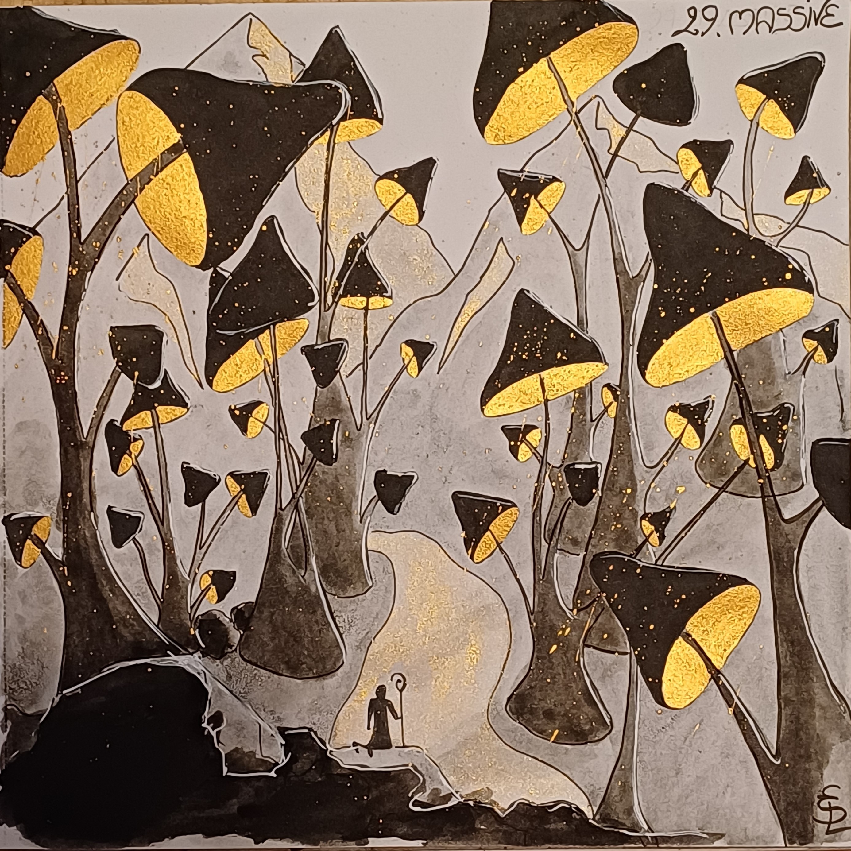 J’ai décidé de me faire plaisir avec celui là, de le faire dans un style que j’aime et avec lequel je pense être à l’aise. Je me suis amusée avec l’encre, pour lui donner un peu plus de relief, et l’encre dorée prend tout son sens avec ce dessin. Je me suis vraiment régalée!