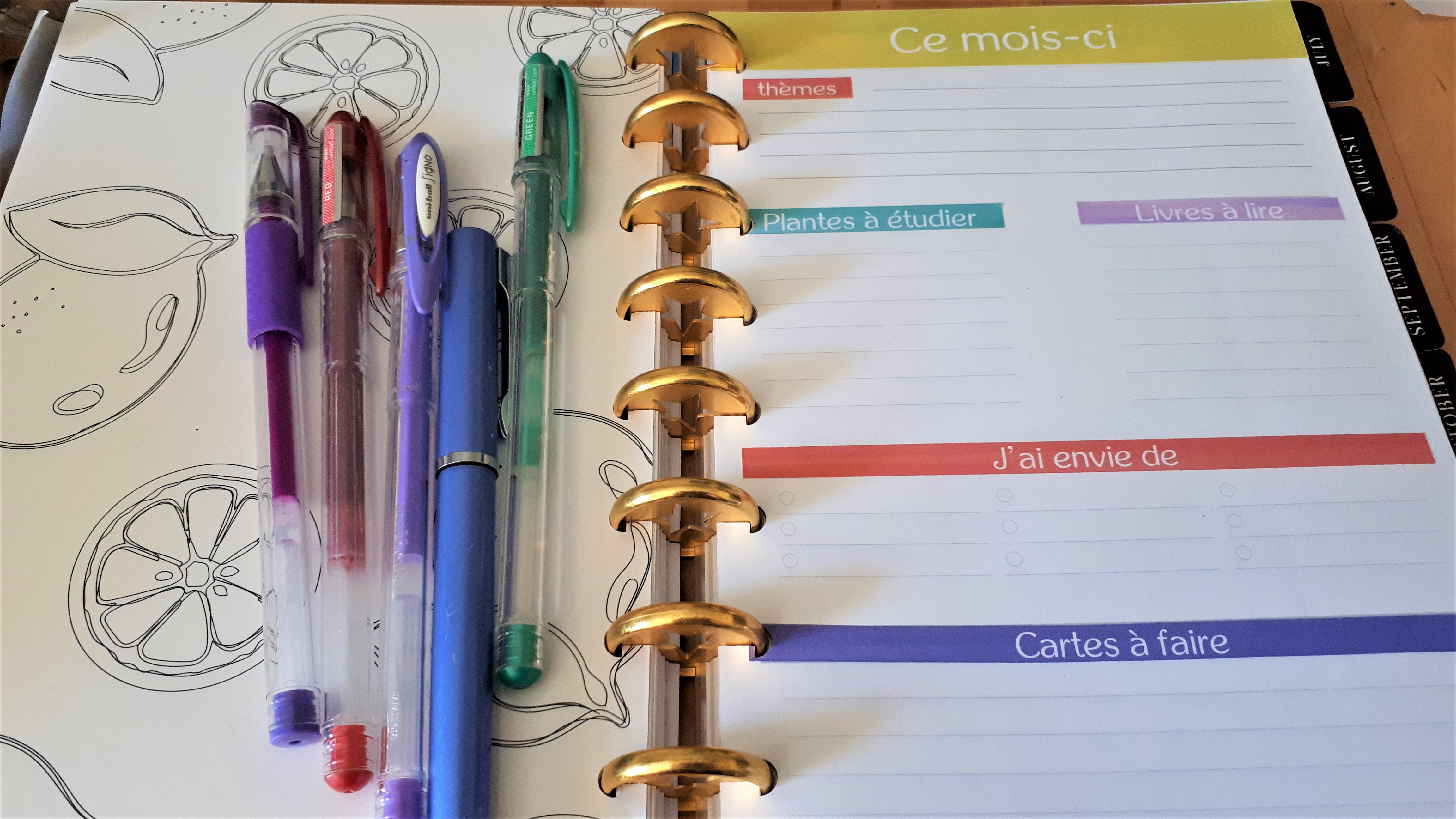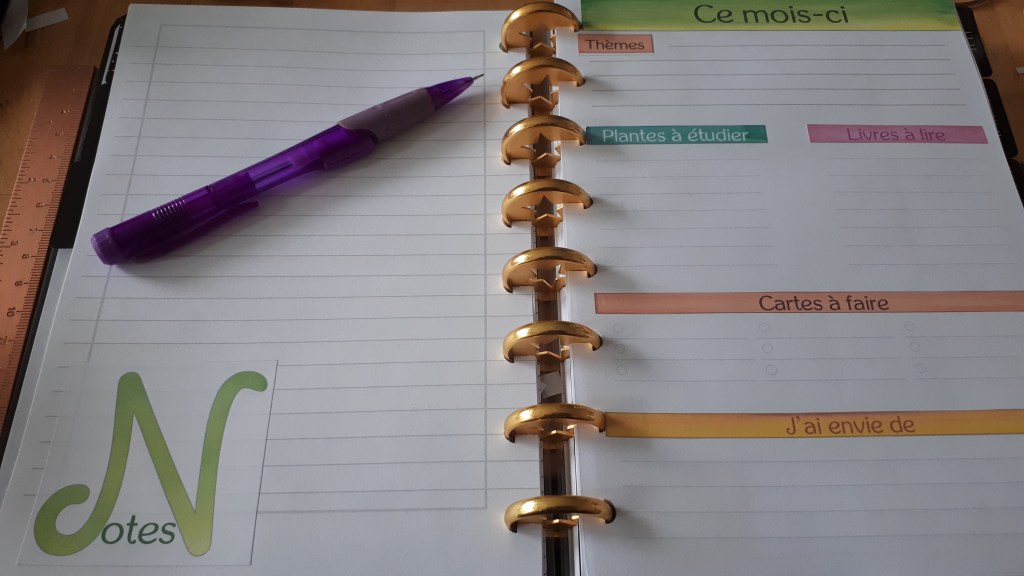J’ai choisi de garder la structure de l’original. Pour mon planner perso, j’ai fait quelques modifications pour qu’il me corresponde vraiment. J’ai échangé Goals, Important dates, birthdays, to do and I want par Thèmes (pour les étapes du Bosquet), Plantes à étudier (parce que j’ai besoin de me remettre à jour et que c’est mon petit plaisir, surtout au printemps avec les allergies qui me rappellent le réveil de la nature (haha)), Livres à lire, cartes à faire, et j’ai envie de. Et j’ai aussi créé d’autres pages, plus personnelles, qui correspondent à mon cheminement et que je ne partagerai pas ici. J’aime vraiment l’idée d’en faire quelque chose qui me ressemble, qui reste simple et que je peux adapter à mes envies.