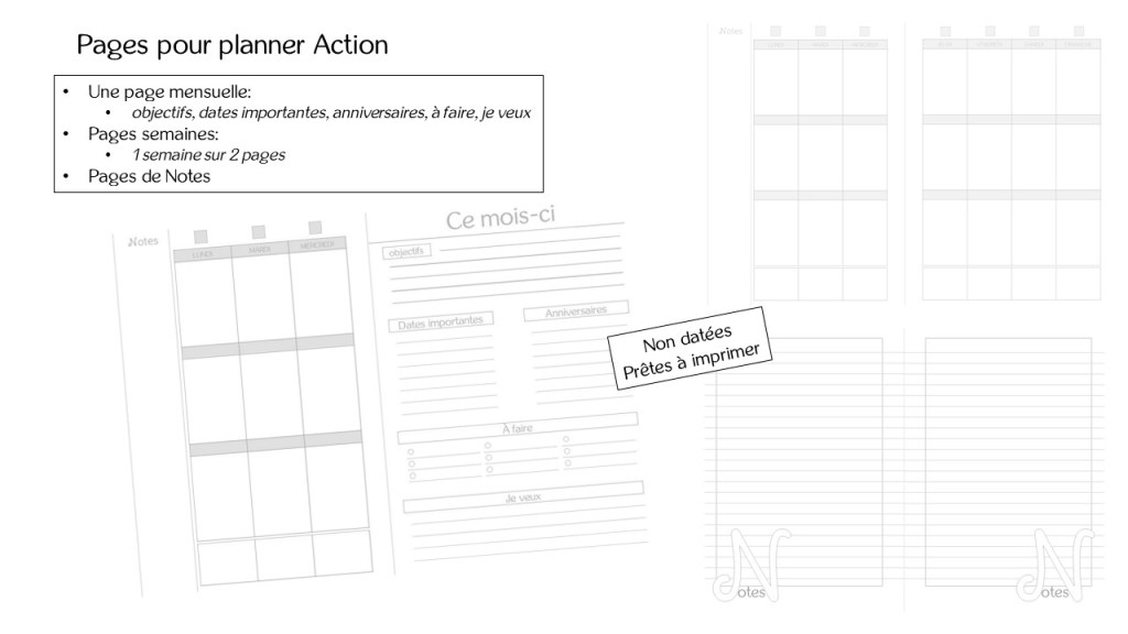 Une fois mes pages prêtes, imprimées découpées et perforées, je me suis dit que je pourrai les refaire pour vous les partager, si vous possédez un planner de chez action. J’ai construit mes pages avec une teinte gris clair, pour que les titres n’apparaissent pas au travers des stickers. J’ai repris les rubriques originelles, en les traduisant en français