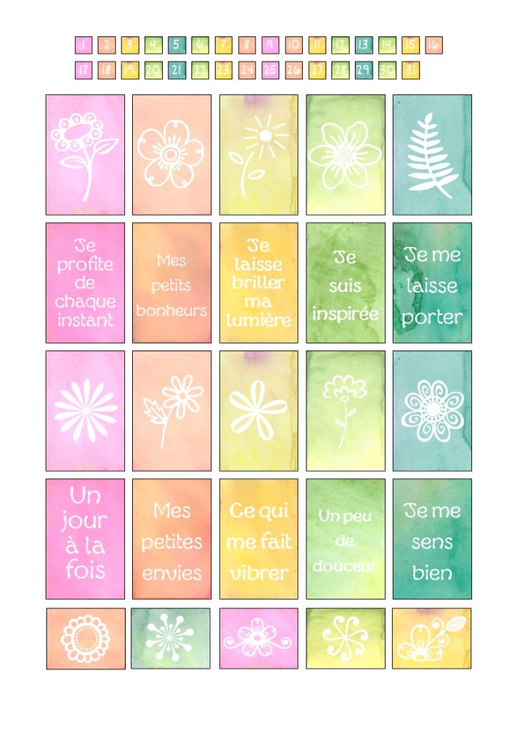 Je me suis rendue compte qu’il manquait des stickers dates… je ne pouvais pas imprimer uniquement ces petits carrés, alors je suis repartie sur mon thème et j’ai ajouté quelques stickers fleurs et quelques phrases motivantes, parce qu’on le mérite bien!! J’espère qu’il vous plairont.