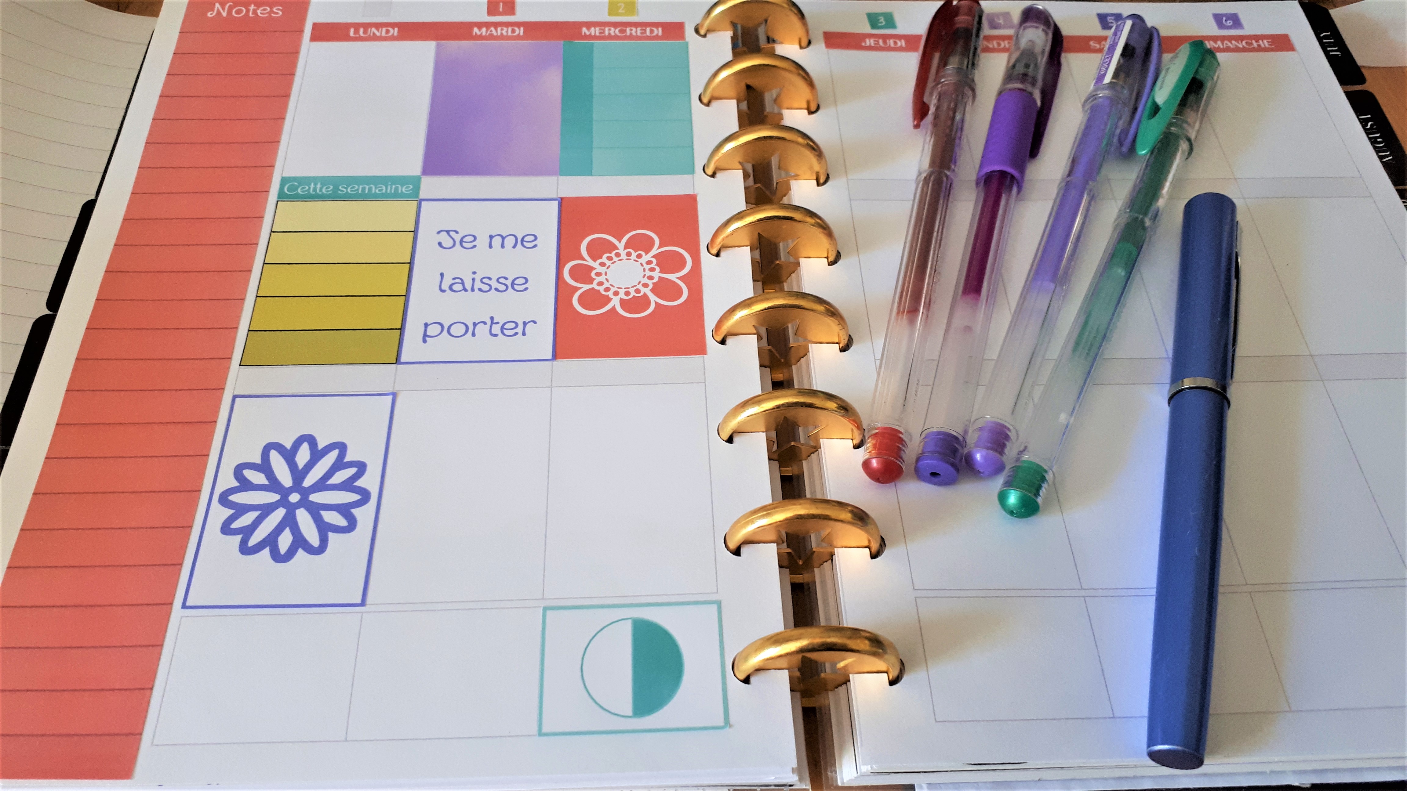 Vous trouverez la base pour le planner ici (c’est un planner que j’ai acheté à action et que j’ai rebidouillé à ma sauce, ma version correspond à mes besoins, mais celle que je vous propose est plus … ‘générale’). Sur la même page, vous avez aussi la base pour la version bujo (bullet journal, je ne l’utilise pas, mais mes copines si, et elles méritent d’avoir des jolis stickers aussi!)