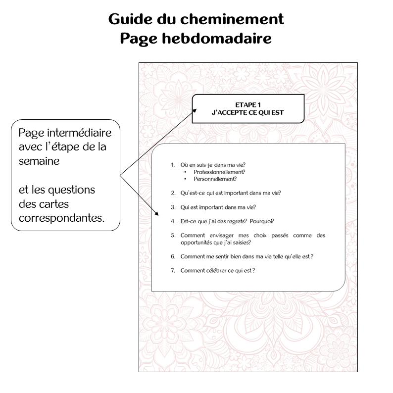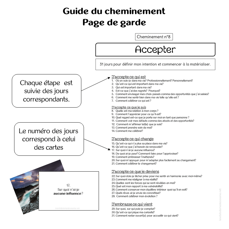 C’est le compagnon du jeu de carte. Il est encore plus complet pour ce cheminement. 37 pages en format A4. Chaque jour a une page dédiée. Il suit le cours du cheminement, avec en plus l’image de la carte concernée.