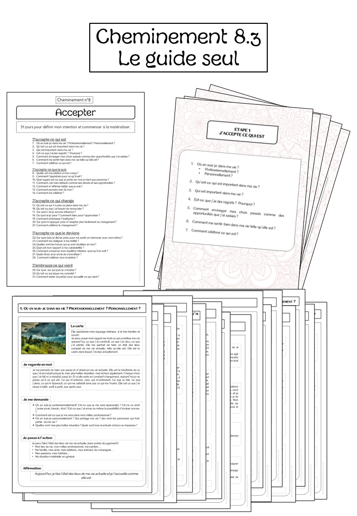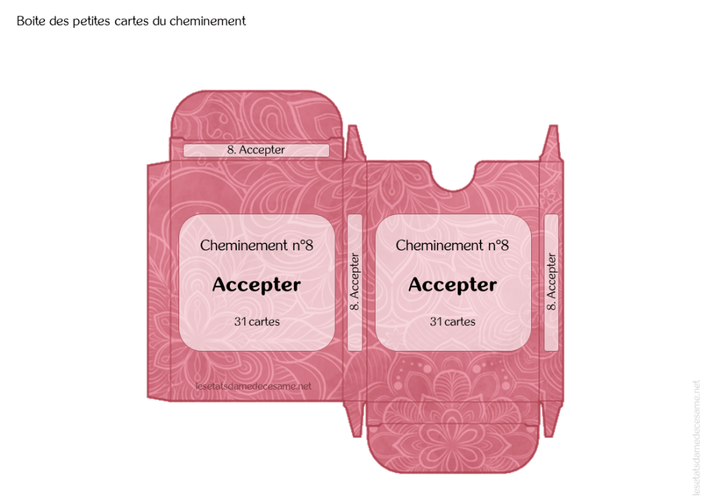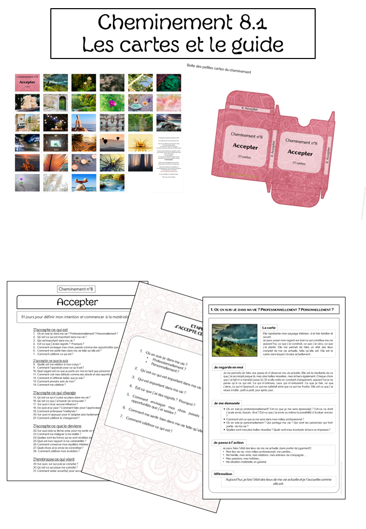 – Le jeu de 31 cartes + 1 carte avec les étapes (9 cartes par page A4). (8 pages) – La boite assortie pour ranger les cartes – le guide du cheminement (36 pages) Contient 3 documents pdf. Imprimer les cartes et la boite de préférence sur sur bristol.