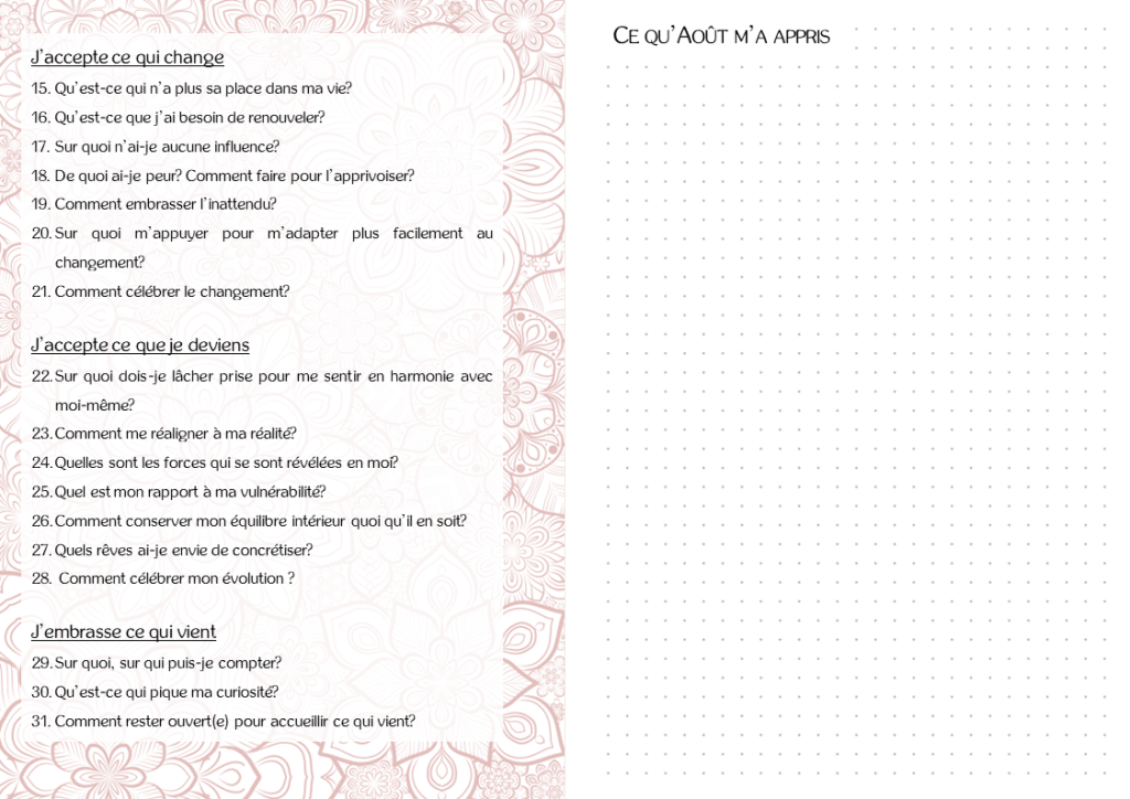 J’ai créé un planner que vous pouvez trouver ici. Il comprend le déroulé du cheminement, avec les questions quotidiennes, et les étapes. Il comprend également une page par semaine. Vous pouvez ainsi écrire sur la page de droite quotidiennement, ou plus longuement sur la page de gauche. Vous pouvez imprimer les pages qui vous intéressent, tout est possible. Ou vous pouvez tout aussi bien cheminer dans un carnet spécifique, dans votre journal, ou ne rien écrire du tout. Il n’y a aucune obligation, juste le plaisir du voyage.