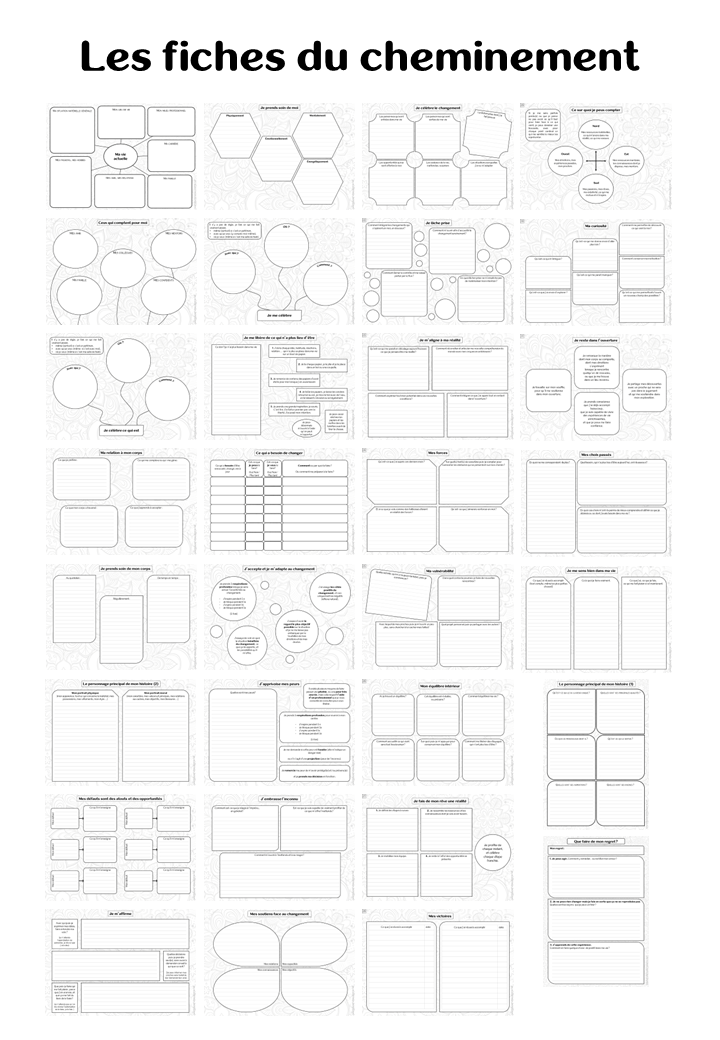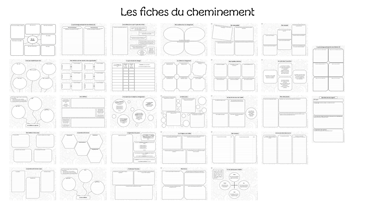 Je les ai créées pour vous permettre de noter noir sur blanc votre cheminement. Elles sont complémentaires aux cartes et au guide, et vous aident à aller un peu plus loin. Elles sont numérotées et correspondent à la progression du cheminement. Elles peuvent être complétées au fur et à mesure, ou ponctuellement, selon vos désirs et vos besoins.