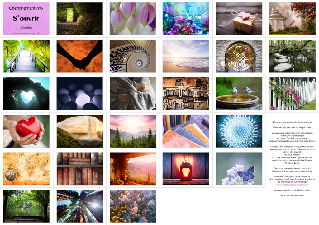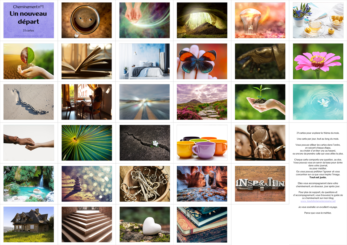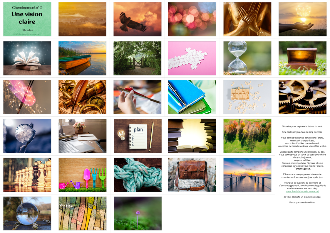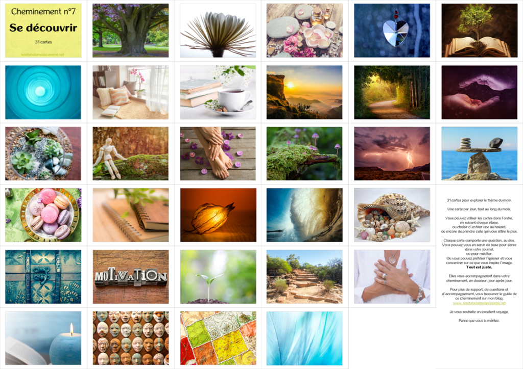 Une page spécifique pour les jeux de cartes petit format ( 7cm x 10 cm) qui servent de support au cheminement. Chaque jeu comprend 30 à 31 cartes (plus une carte titre), avec une image inspirante au recto et une question au verso.
