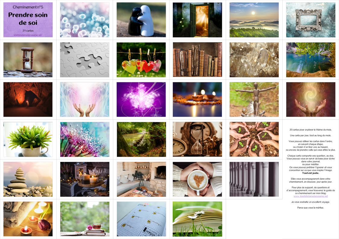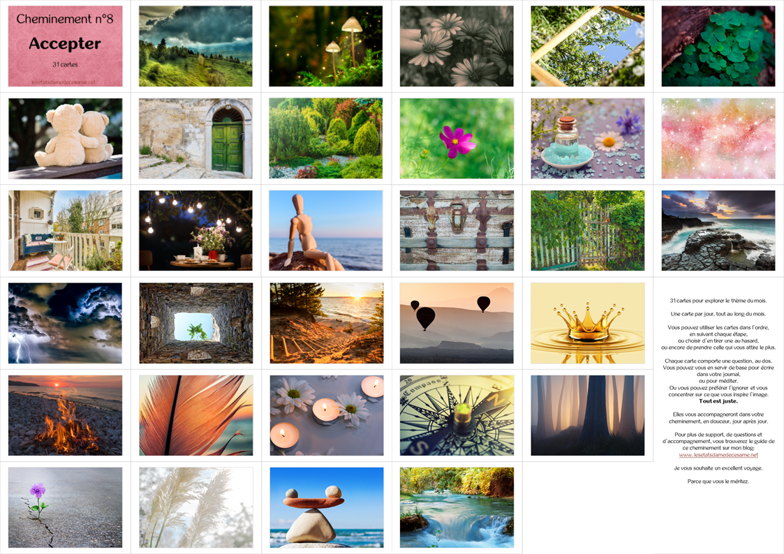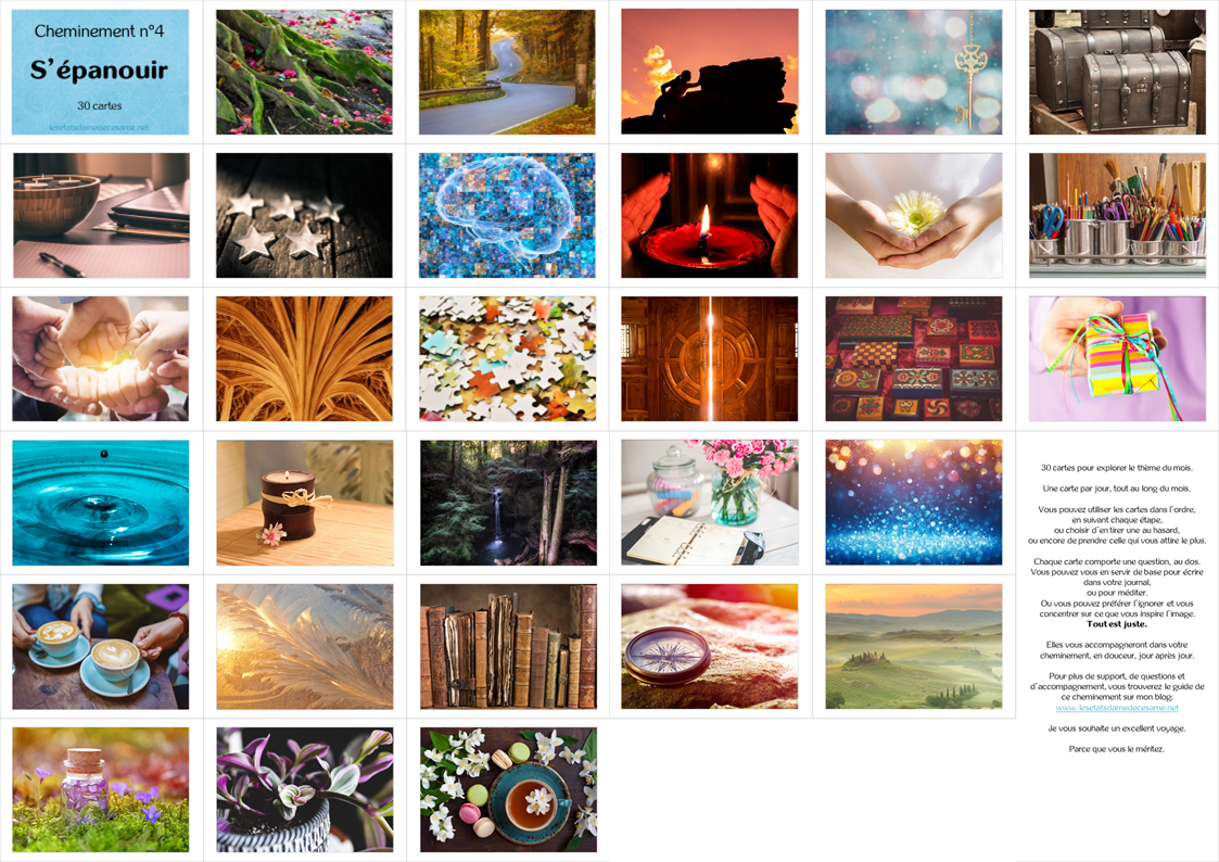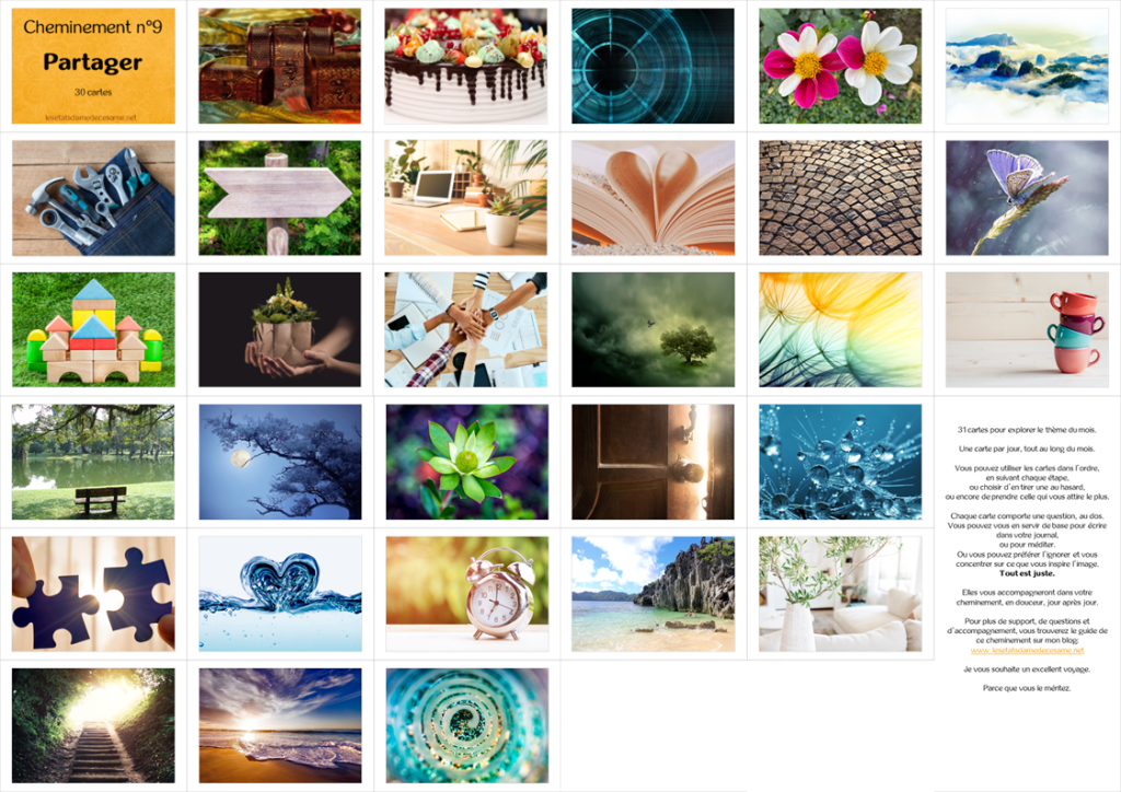 Une page spécifique pour les jeux de cartes petit format ( 7cm x 10 cm) qui servent de support au cheminement. Chaque jeu comprend 30 à 31 cartes (plus une carte titre), avec une image inspirante au recto et une question au verso.