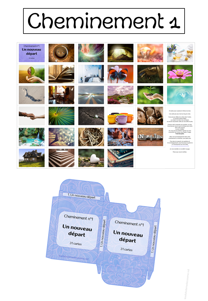 Le jeu de carte et sa boite, correspondant au cheminement n°1: un nouveau départ. 2 pdf: – 1 pdf de 8 pages contenant les cartes, à imprimer en recto-verso – 1 pdf d’une page, contenant la boite assortie à imprimer, découper et coller Je vous conseille d’imprimer les cartes et la boite sur du bristol.