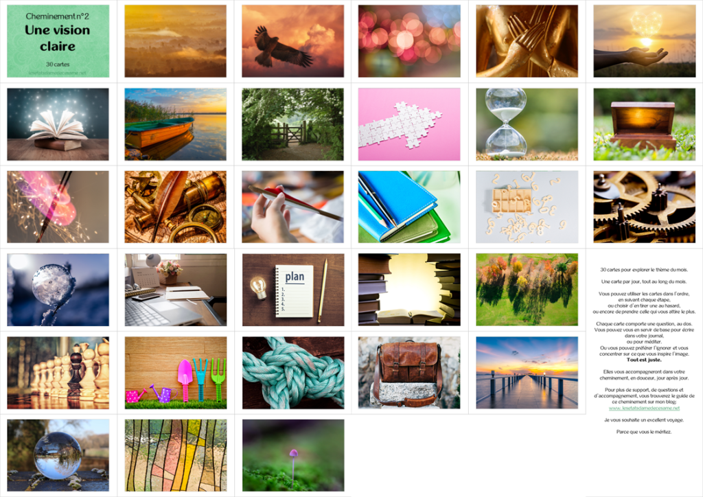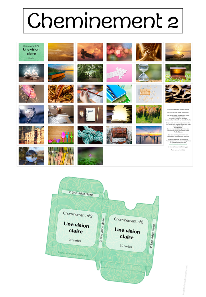 Le jeu de carte et sa boite, correspondant au cheminement n°2: une vision claire 2 pdf: – 1 pdf de 8 pages contenant les cartes, à imprimer en recto-verso – 1 pdf d’une page, contenant la boite assortie à imprimer, découper et coller Je vous conseille d’imprimer les cartes et la boite sur du bristol.