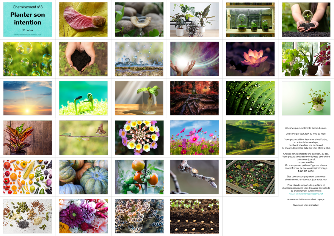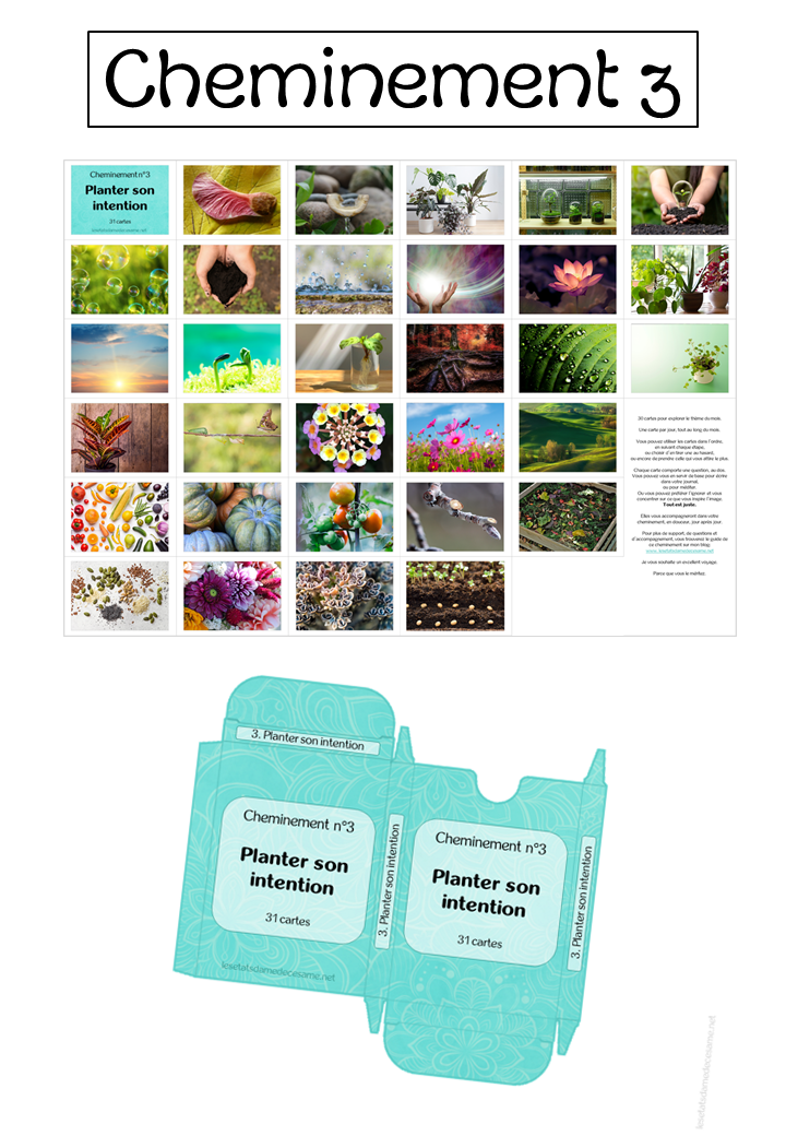 Le jeu de carte et sa boite, correspondant au cheminement n°3: planter son intention 2 pdf: – 1 pdf de 8 pages contenant les cartes, à imprimer en recto-verso – 1 pdf d’une page, contenant la boite assortie à imprimer, découper et coller Je vous conseille d’imprimer les cartes et la boite sur du bristol.