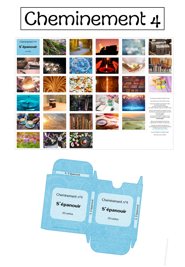 Le jeu de carte et sa boite, correspondant au cheminement n°4: s’épanouir 2 pdf: – 1 pdf de 8 pages contenant les cartes, à imprimer en recto-verso – 1 pdf d’une page, contenant la boite assortie à imprimer, découper et coller Je vous conseille d’imprimer les cartes et la boite sur du bristol.