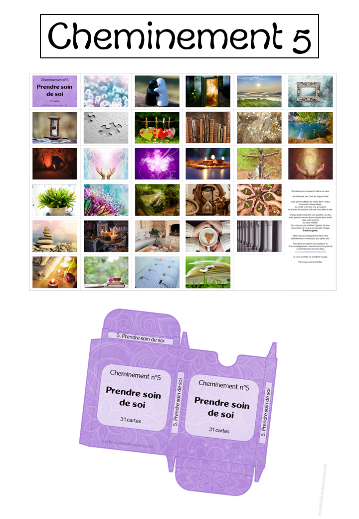 Le jeu de carte et sa boite, correspondant au cheminement n°5: prendre soin de soi 2 pdf: – 1 pdf de 8 pages contenant les cartes, à imprimer en recto-verso – 1 pdf d’une page, contenant la boite assortie à imprimer, découper et coller Je vous conseille d’imprimer les cartes et la boite sur du bristol.
