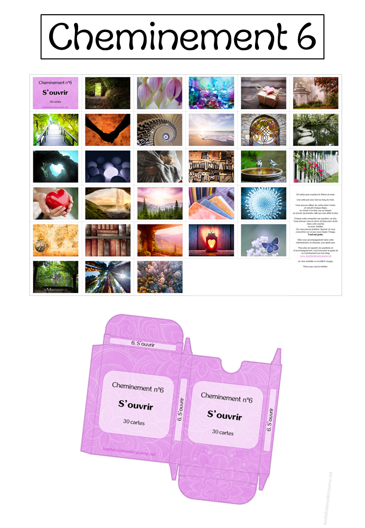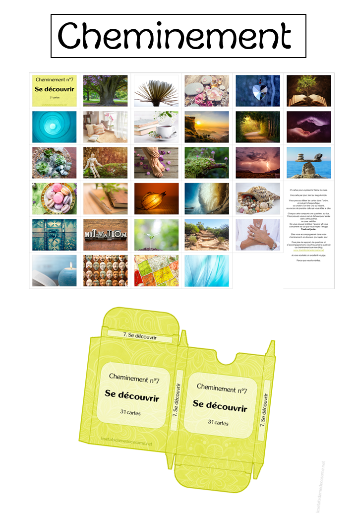 Le jeu de carte et sa boite, correspondant au cheminement n°7: se découvrir 2 pdf: – 1 pdf de 8 pages contenant les cartes, à imprimer en recto-verso – 1 pdf d’une page, contenant la boite assortie à imprimer, découper et coller Je vous conseille d’imprimer les cartes et la boite sur du bristol.
