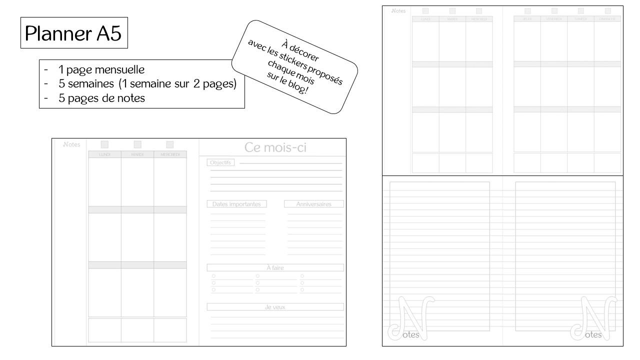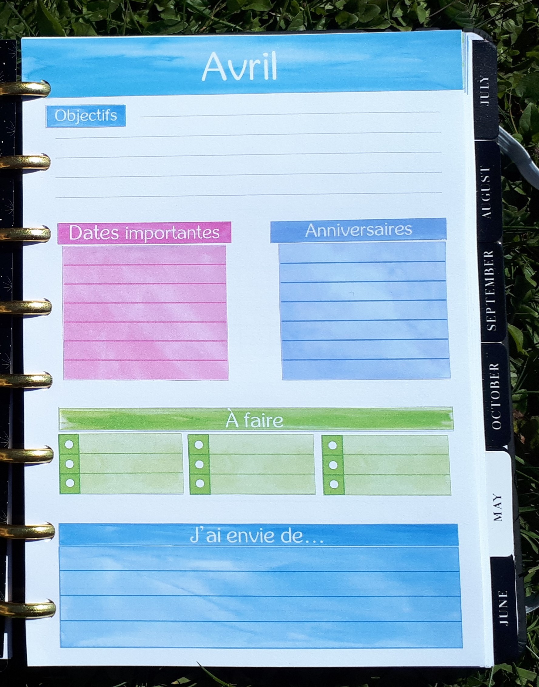 Vous trouverez ici tous les documents pour constituer votre planner A5. Il ne s’agit que des pages intérieures, puisque je me sers d’un planner existant. Mais je songe à refaire les intercalaires mensuelles….