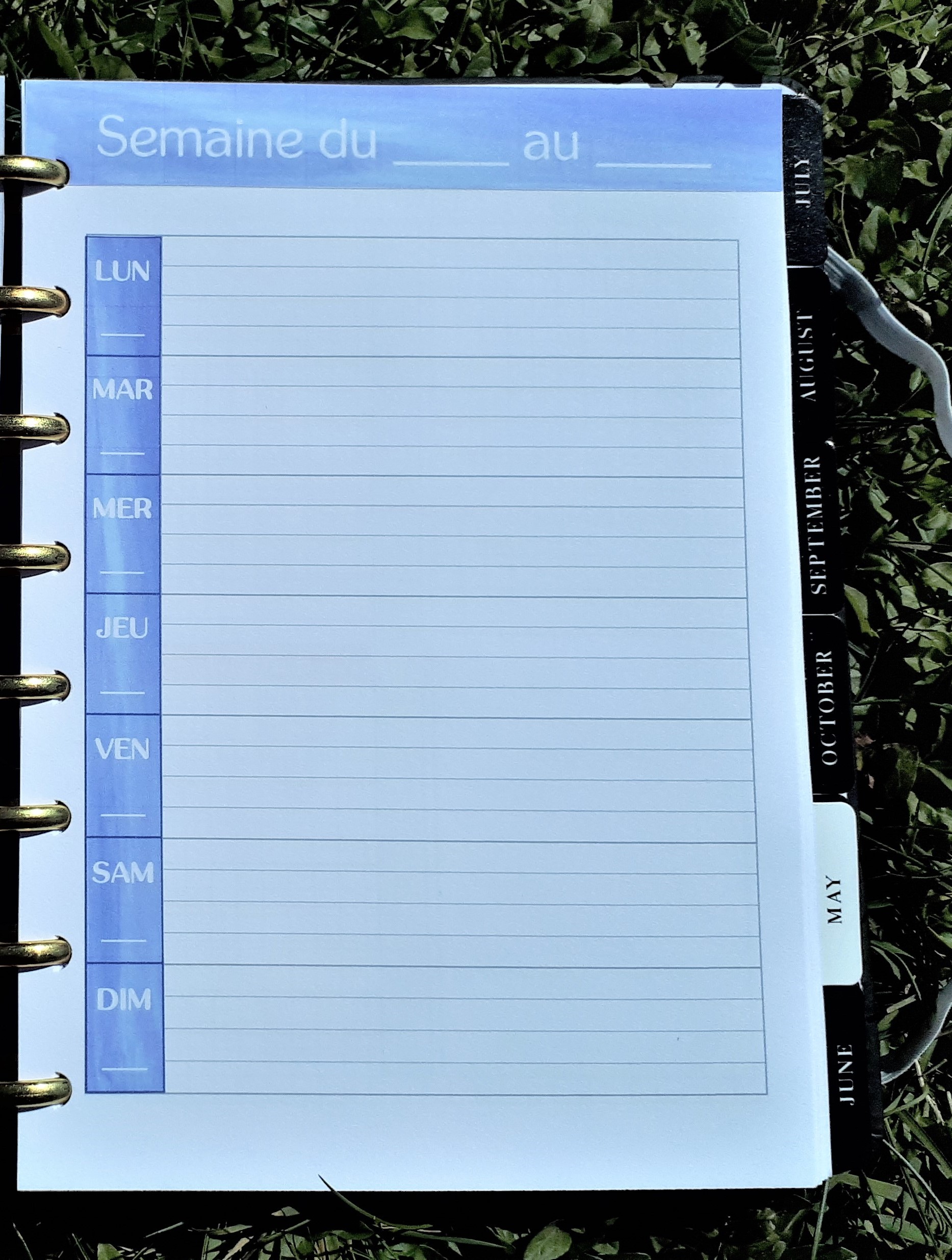 - Les pages hebdomadaires (1 semaine sur deux pages, 5 semaines sont comprises dans le pdf)