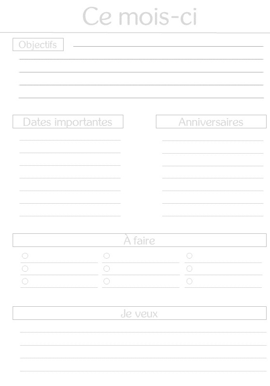 - les pages hebdomadaires. J’ai également ajouté une page de collection pour faciliter l’impression. Il y a aussi deux espaces libres pour gribouiller, noter une citation importante pour vous, ou coller un des stickers que je vous propose. Attention, vous devrez les imprimer autant de fois qu’il y a de semaines dans le mois!