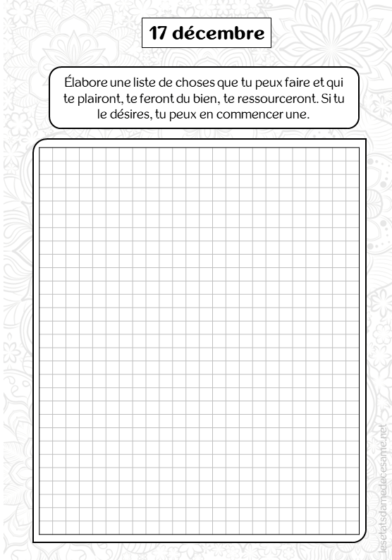 17. Élabore une liste de choses que tu peux faire et qui te plairont, de feront du bien, te ressourceront. Si tu le désires, tu peux en commencer une.