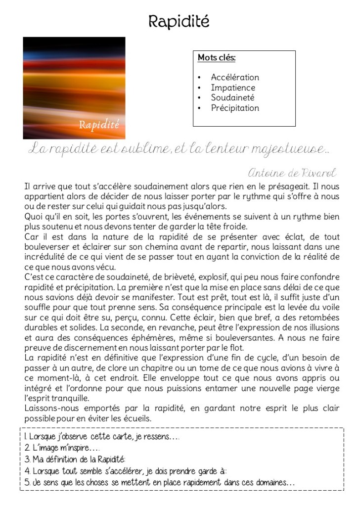 J’ai l’impression que la rapidité est dans l’air du temps… Ou c’est l’effet de la pleine lune sur mon rythme nocturne dû aux grosses chaleurs… Quoi qu’il en soit, tout semble s’accélérer, se mettre en place sans délai et ça fait un bien fou! Depuis quelques temps, j’avais l’impression de mettre fin à des tas de choses. Si je le faisais sereinement, je sentais aussi que ça signifiait la fin d’un cycle, et la mise en place d’éléments du suivant. Et je pense que tout va s’accélérer dans les prochains jours, ce qui me réjouit!
