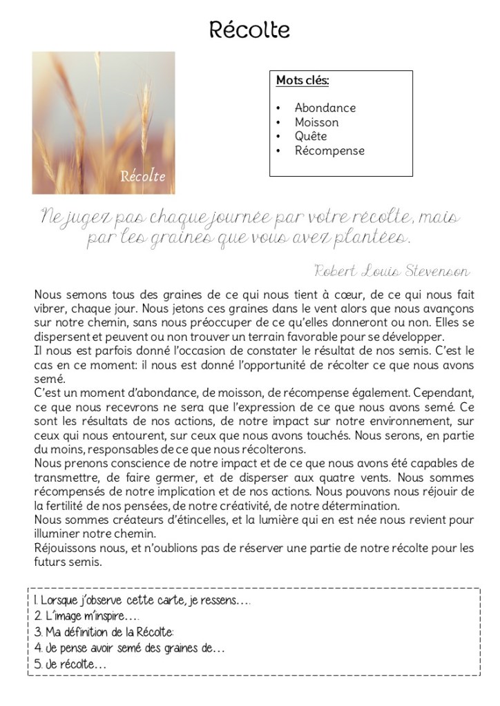 Lorsque je sens en moi ce besoin d’exprimer quelque chose, ou que je sens que je suis dans une voie sans issue, je pars à la recherche de ces champs, en ouvrant mon esprit, mes yeux et mon cœur. Je saisis les indices qui ne manquent pas de se présenter et qui me guident à bon port.
