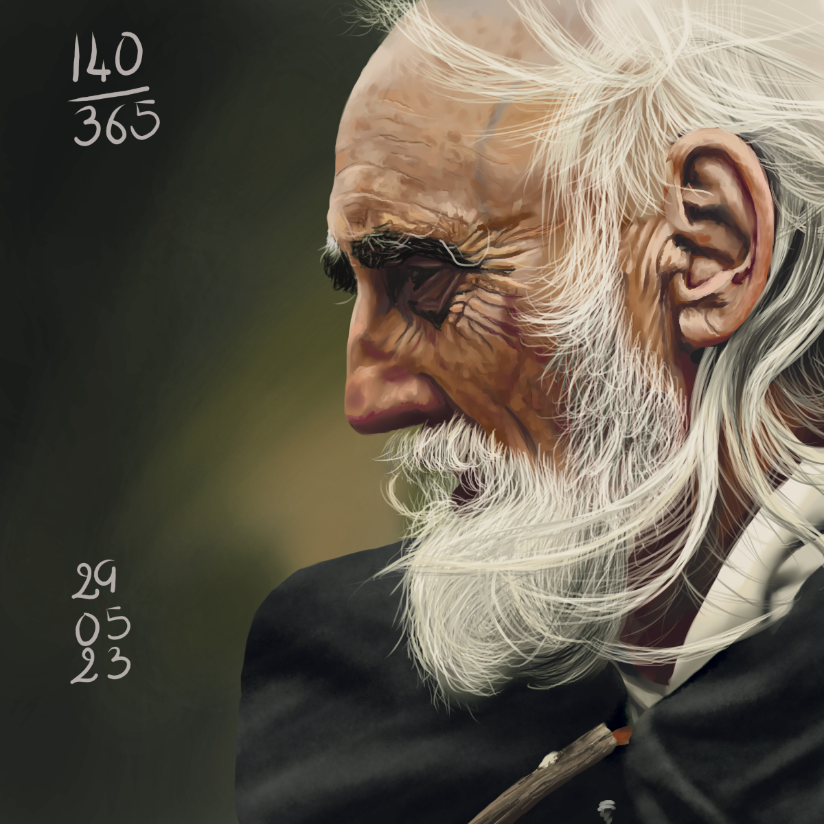 La référence du challenge était un autre pépé. Et là, non, stop. J’ai donc fouillé dans mon dossier de références et j’ai trouvé celle-ci, qui répondait joliment à celle de la veille, la couleur en plus. J’avoue, j’ai passé beaucoup beaucoup de temps sur ses cheveux, mais j’avais vraiment envie de trouver comment rendre leur texture particulière. Je crois que je suis plutôt pas mal, là. J’ai par contre encore des progrès à faire pour la barbe (détail technique: il me suffisait de baisser le débit du brush, mais j’ai zappé, et du coup, ce n’est pas terrible). Leçon retenue!