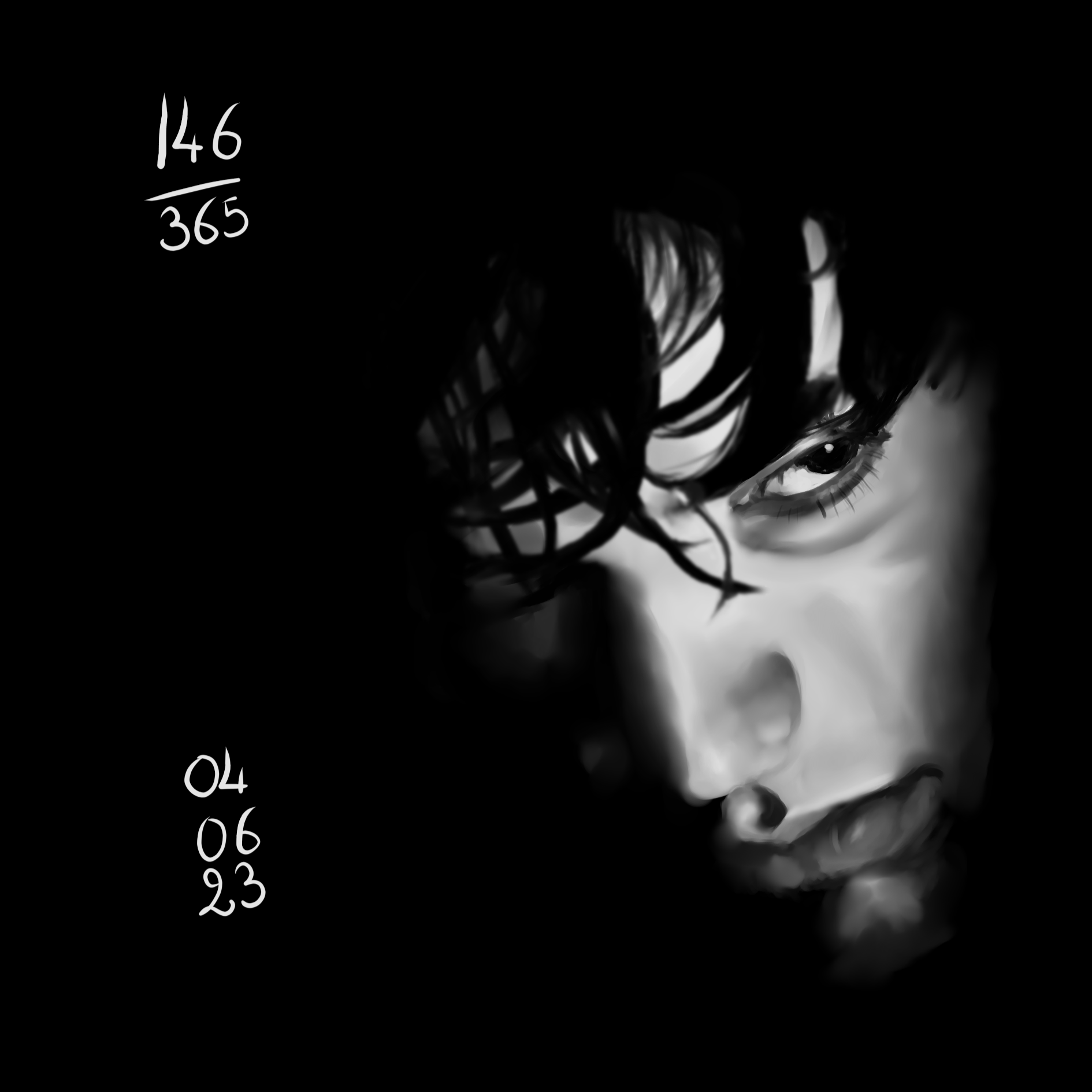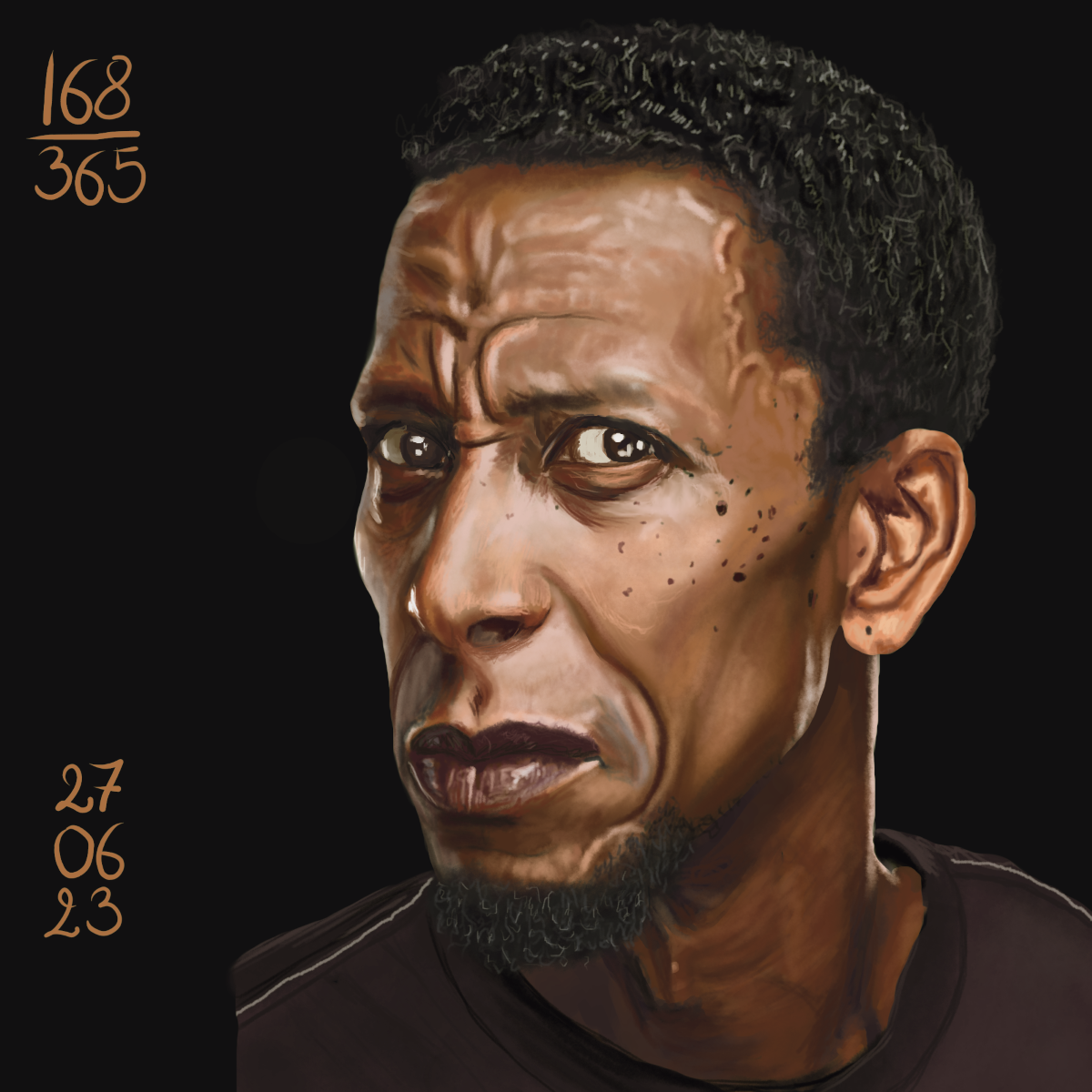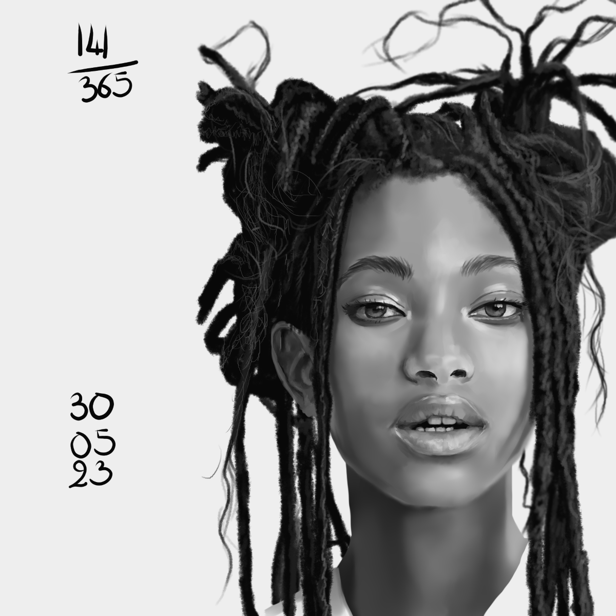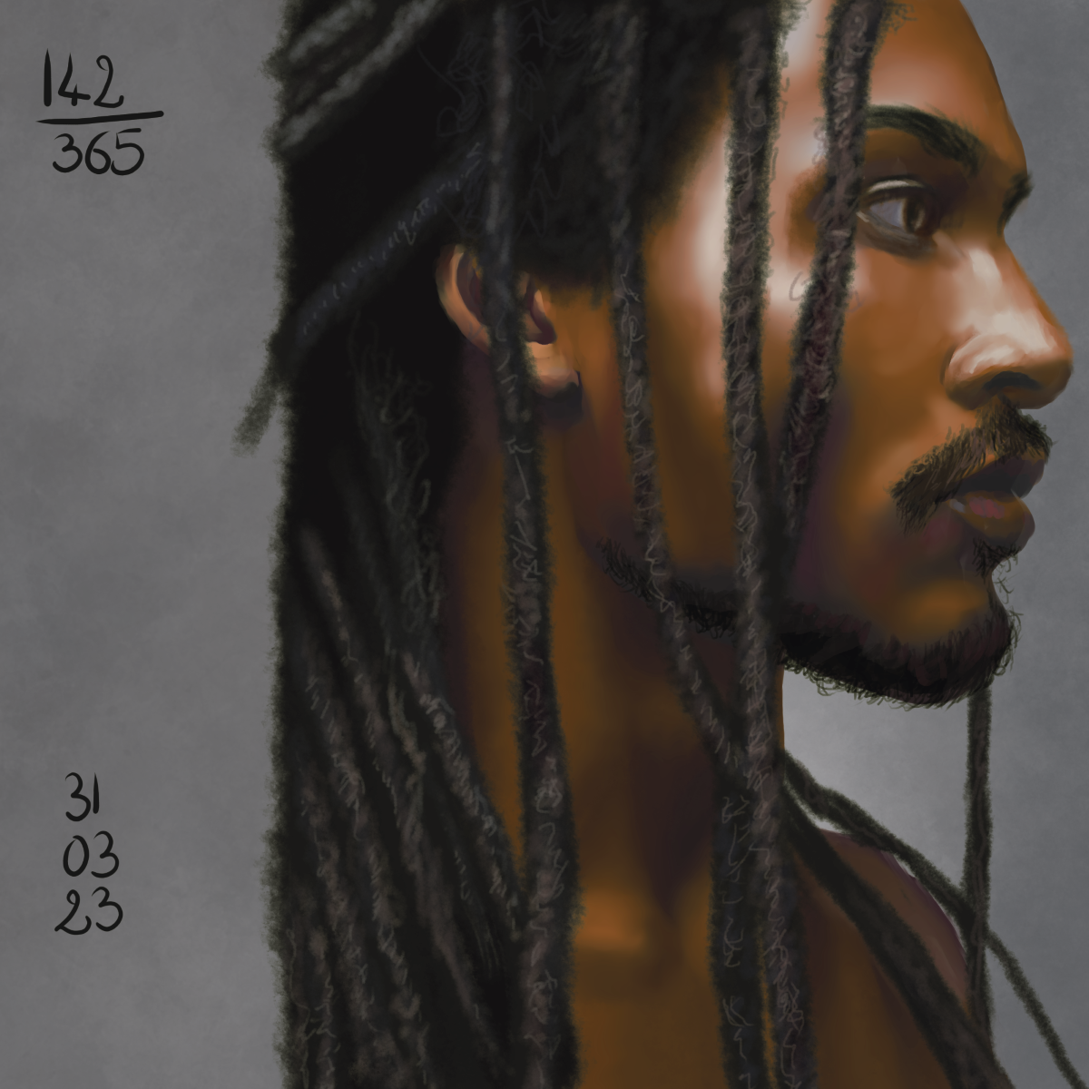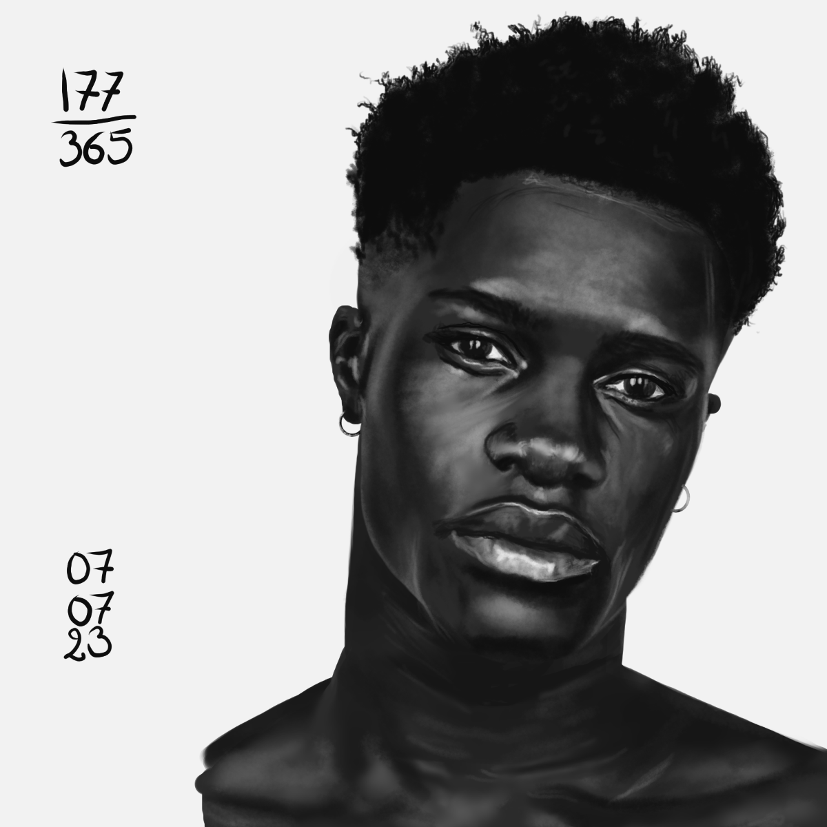 Et là, tout était plus simple… je me sens tellement plus à l’aise en noir et blanc!! J’ai vraiment beaucoup aimé cette référence (et je me suis régalée avec ses cheveux crépus!!). J’ai utilisé une brush texturée, pour le plaisir, et parce que ça me fait du bien de temps en temps de ne pas me reposer sur ma mixer brush préférée, histoire de m’entrainer à d’autres techniques. Et pour le coup, je me suis amusée avec les paramètres de ma brush texturée, la transparence, le flux etc, tout au long de ce portrait. Et ça m’a vraiment fait du bien.