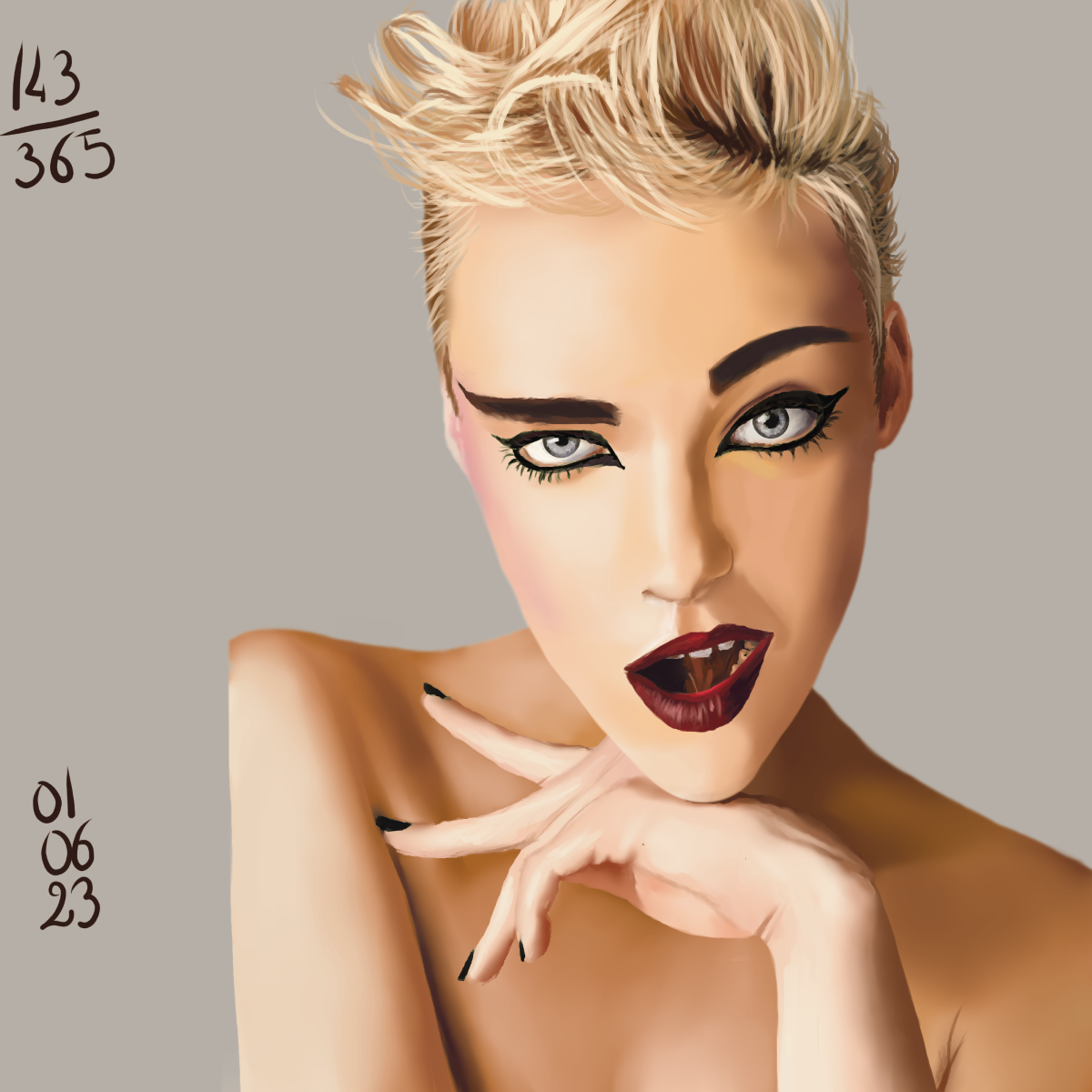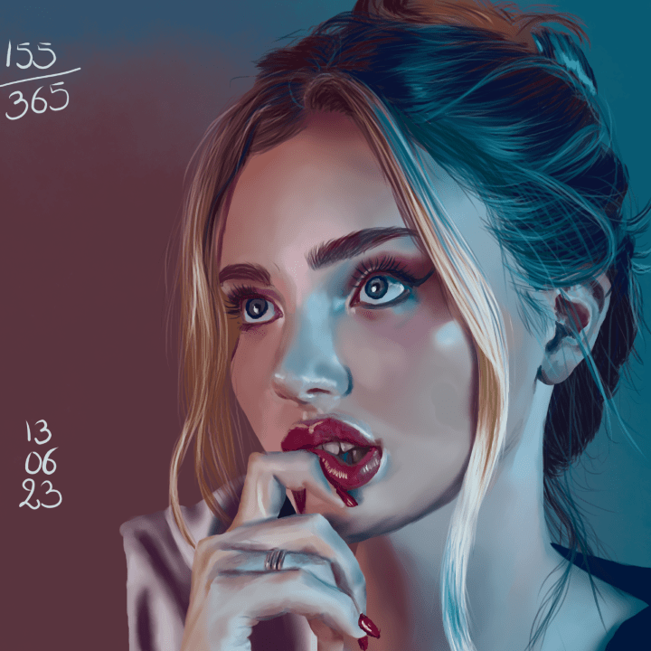 Pfiou! Entre la pose, la main, les cheveux, le maquillage et la lumière de cette référence, je savais que ça allait me prendre un bon moment. Et bingo. Mais j’en suis venu à bout, non mais oh! Je suis particulièrement fière de ma main, hehe.