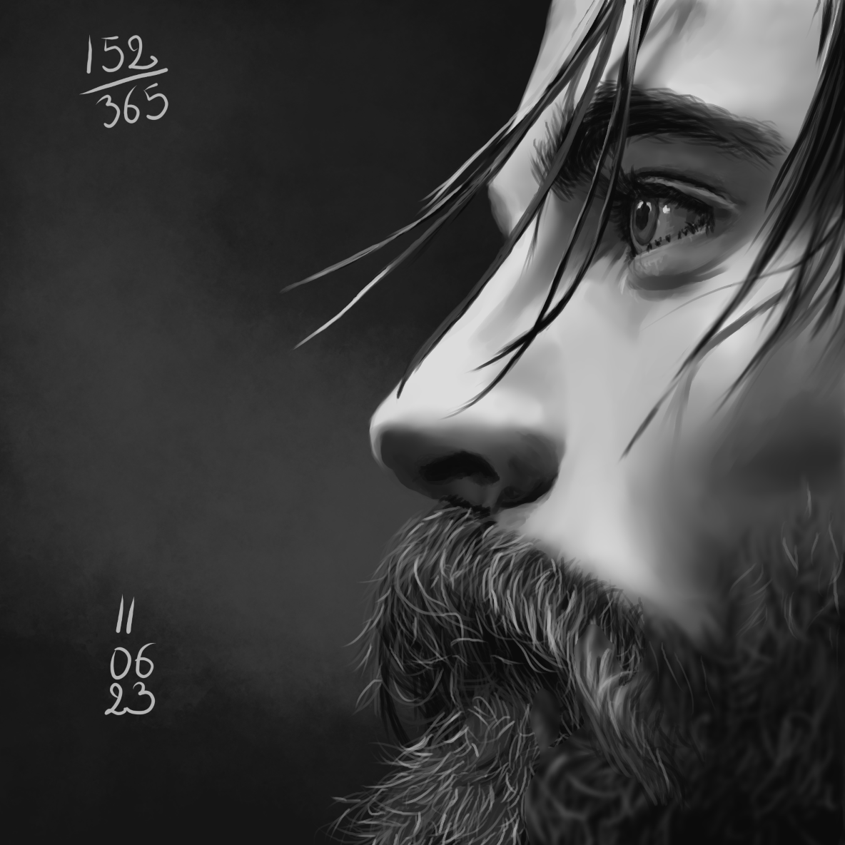 Ce regard! Encore le même genre de lumière et d’ombre, mais j’en ai moins peur maintenant. Et des poils, plein de poils… Il y a encore du boulot pour la moustache, mais je pense que la barbe n’est pas si mal… et je me suis donnée pour mission de réussir à rendre les moustaches et les sourcils correctement dans le futur proche. Au boulot!
