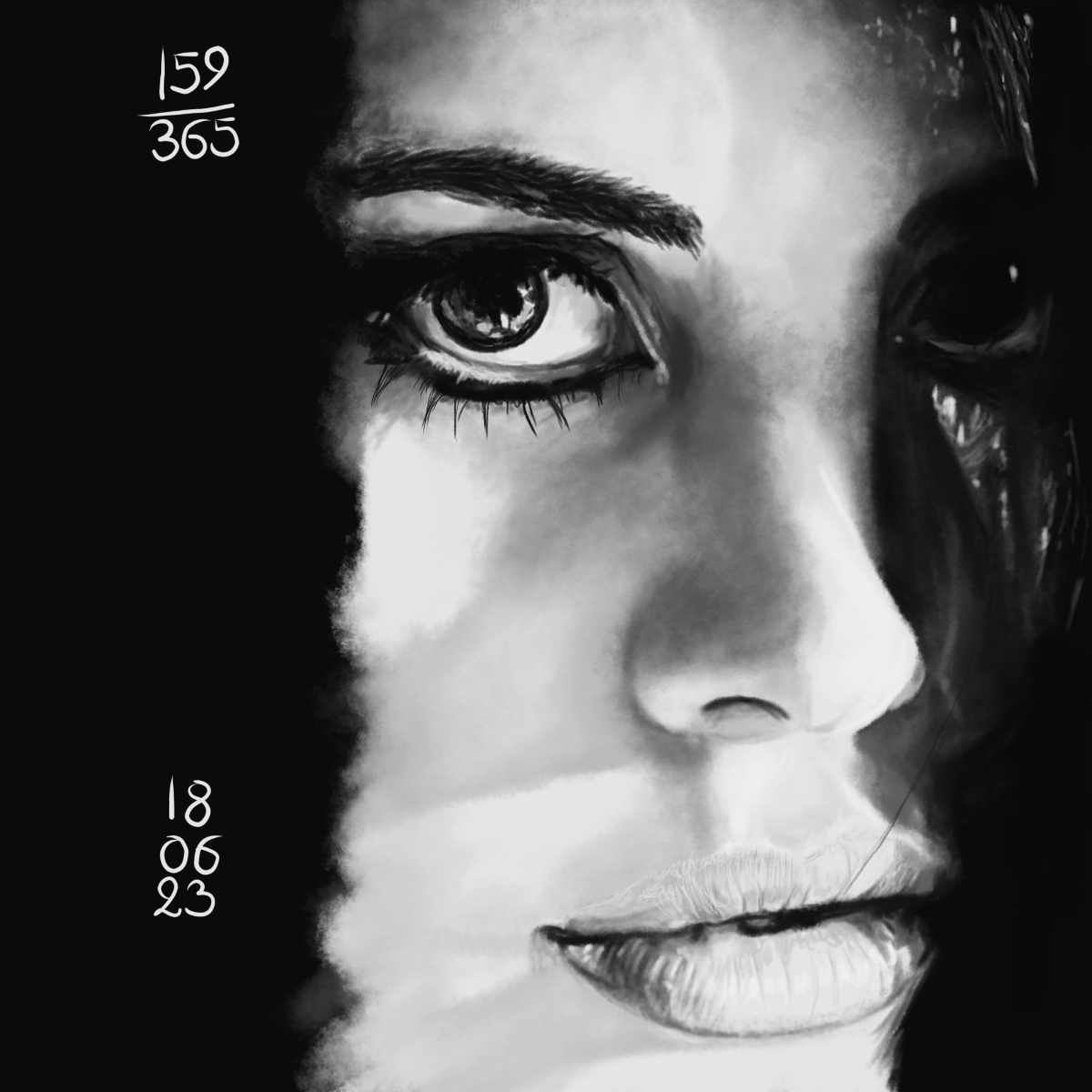 Les mains ne me font plus peur hahaha. même si j’ai encore passé beaucoup de temps à la dessiner. Pour le reste, un portrait qui s’intégrait dans ma zone de confort, un véritable plaisir à étudier. Cet angle, ces ombres et ces lumières, ces cheveux, tout était intéressant et instructif. Je suis vraiment satisfaite du résultat.