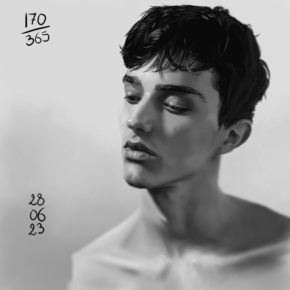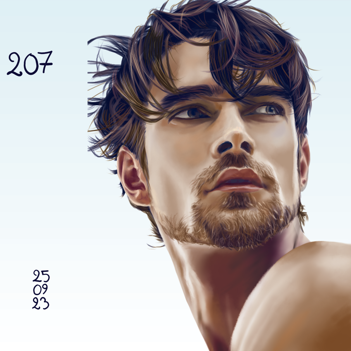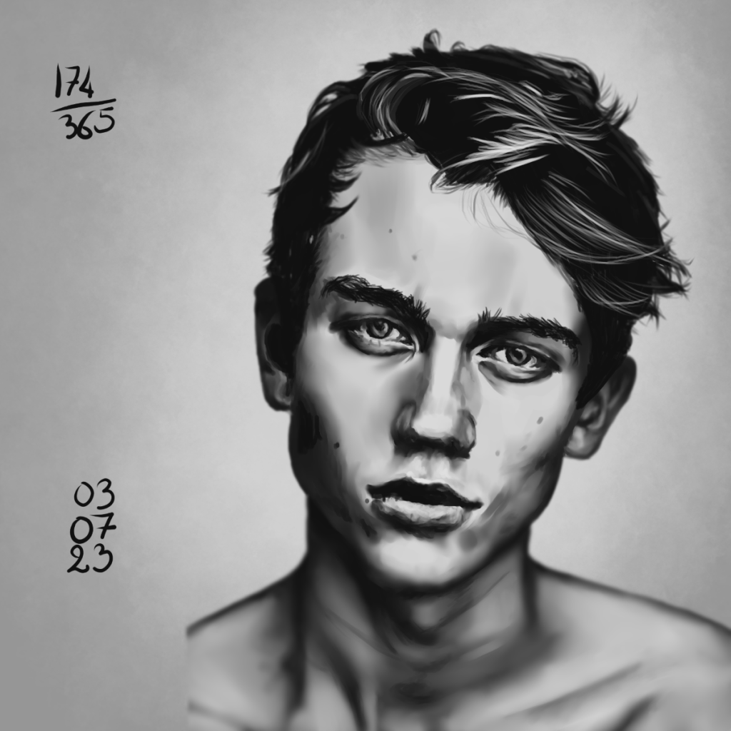 Et on a commencé avec cette référence là… les cheveux plaqués, c’est la vie, clairement! Référence super intéressante au niveau des ombres, ça change un peu, et cet effet sur son torse! J’ai retrouvé mon enthousiasme et ma motivation. Ne jamais rester sur un échec! Du coup, j’ai travaillé sur un seul calque, juste pour le plaisir de me prouver à moi-même que j’en étais capable!