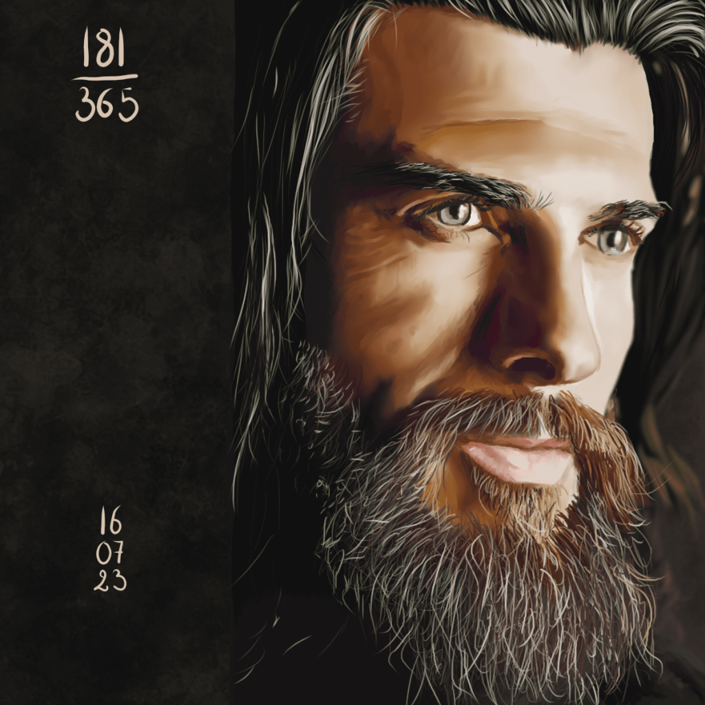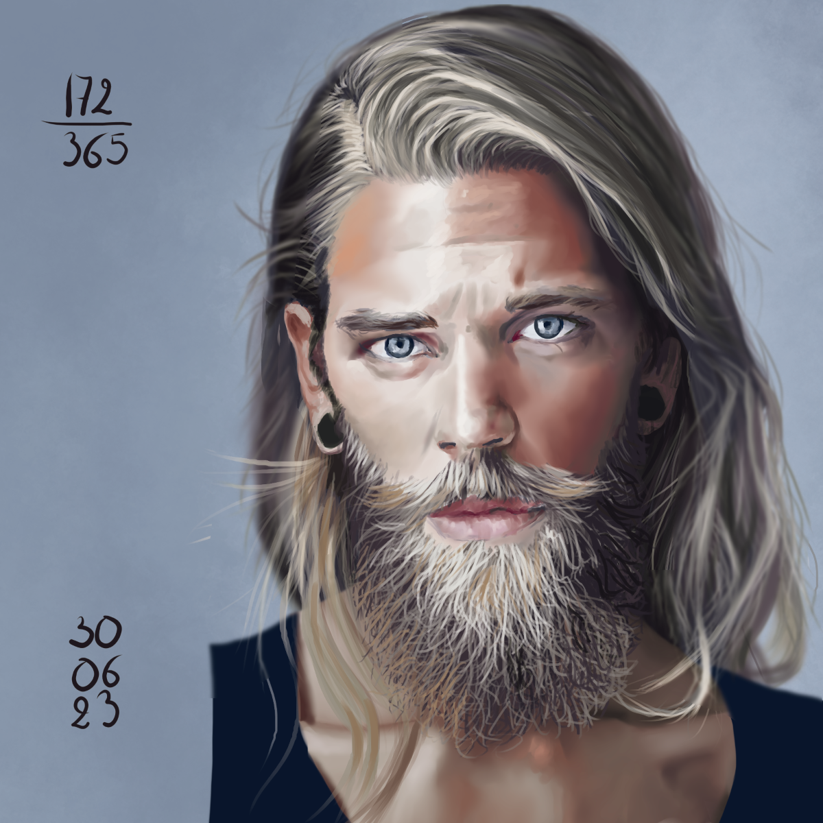 Parfois tout va bien, et je me pose une limite claire de temps… et juste à la fin, je saccage tout mon travail… là, j’ai ajouté des valeurs trop foncées et trop délimitées sur la gauche de sa bouche, et ça gâche tout… mais j’ai dit temps limité, et une fois que le timer retentit, je n’y touche plus… Maintenant, je ne regrette pas de l’avoir conservé comme ça: c’est un rappel de rester concentrée et de toujours dézoomer pour avoir une vue plus globale… pour le reste, pas mal du tout cette barbe!
