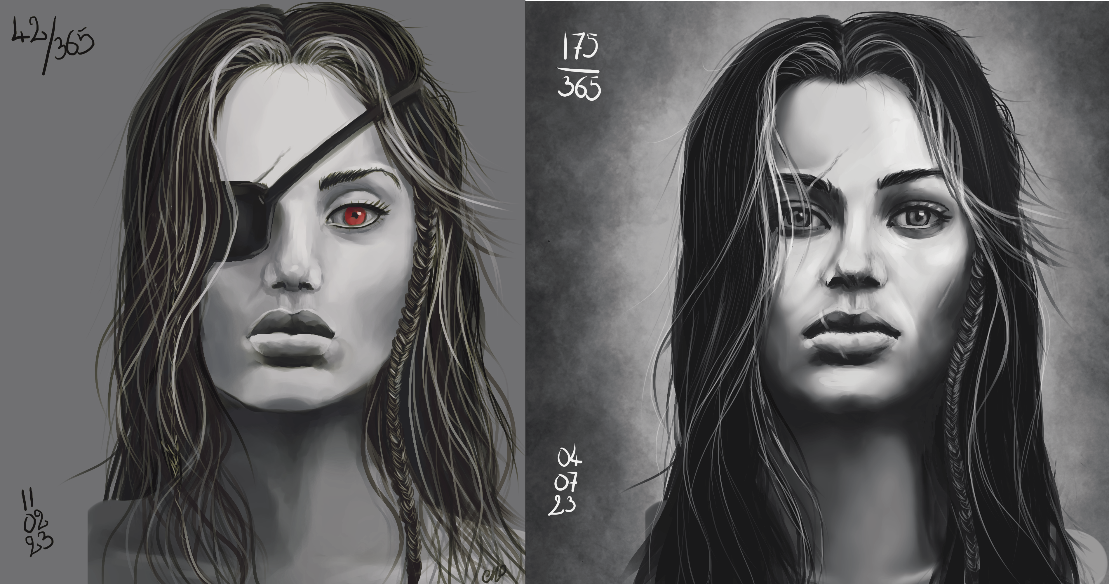 Tout s’est considérablement amélioré! J’ai même fait les deux yeux hahaha. Le contraste est meilleur, les volumes sont plus francs, les yeux plus réalistes, le nez ressemble à un véritable nez, la bouche est plus définie, le menton aussi, les cheveux sont bien mieux. je me suis même amusée à lui faire quelques cicatrice (parce que c’est une pirate, à la base, hein). J’ai encore du travail, mais vraiment, j’étais surprise d’être capable de faire ça, alors que, je le rappelle, je n’avais jamais dessiné de portrait avant janvier. L’entrainement quotidien porte ses fruits! J’avoue, ça m’a donné un petit coup de boost, plus que bienvenu, pour persister et m’améliorer encore… Elle reviendra dans quelques mois, et j’ai hâte de voir ce que ça donnera alors!