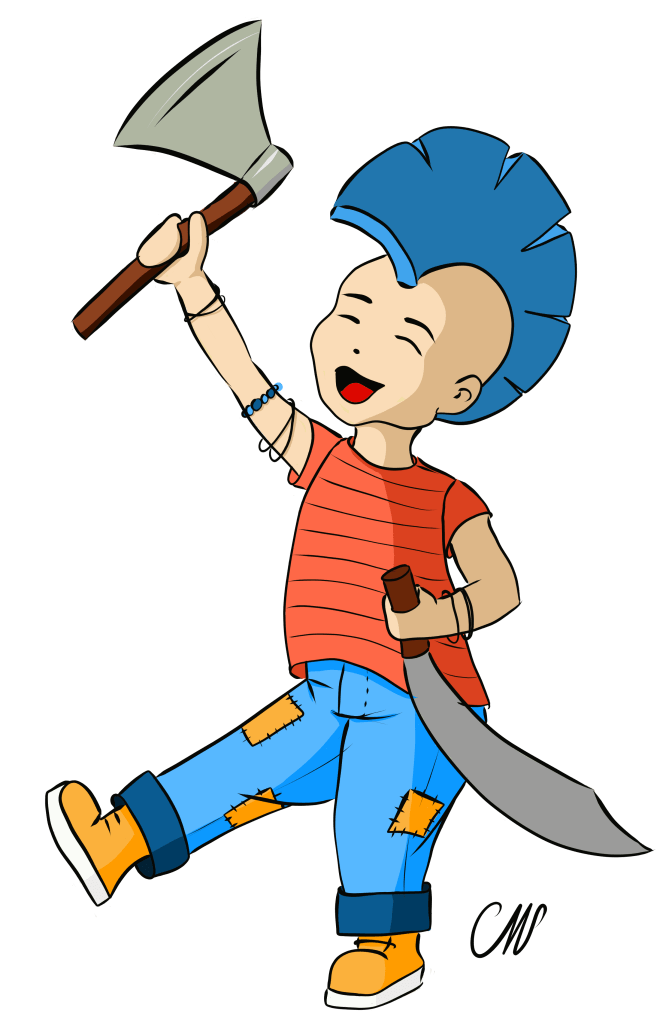 Lorsque je pense à mon enfant intérieur, je visualise très facilement ce petit bonhomme. Oui, c’est un garçon…. oui il a une crête…. et il est lourdement armé…. Un côté rebelle avec son iroquoise et son sabre de pirate et joyeux de partir se battre pour la bonne cause, hache en main (ça aurait pu/du être une hallebarde, j’ai un truc avec les hallebardes, mais j’ai choisi la hache pour cette fois)…Si je n’ai aucun souci avec ma féminité, j’ai clairement bien ancré, depuis toujours, ce caractère rebelle et un peu masculin… un vrai garçon manqué… qui a du faire pas mal d’effort pour trouver et accepter sa part de féminité… Aujourd’hui, j’ai trouvé un équilibre entre mon côté féminin (la preuve: j’ai les ongles vernis, ah!) et ma nature plus… masculine. Entre mon côté calme, posé, et ma nature de guerrière… Entre la douceur dont je peux faire preuve et mes envolées lyriques… entre mon aspect très féminin et mon caractère beaucoup plus masculin… Bref, voila ma proposition pour ce seizième jour d’Inktober, version digitale!