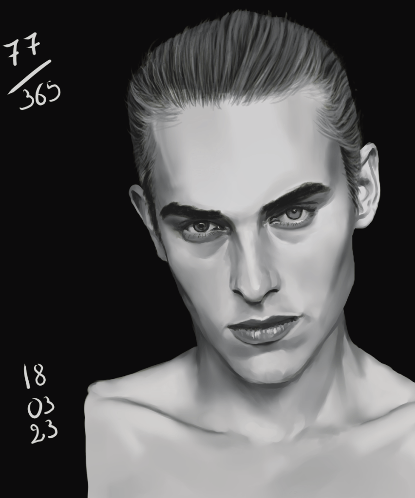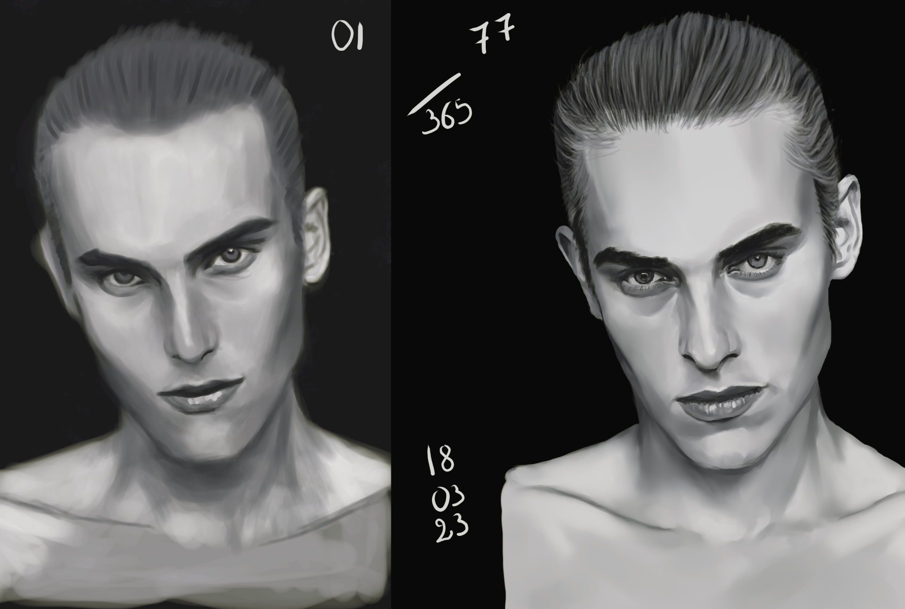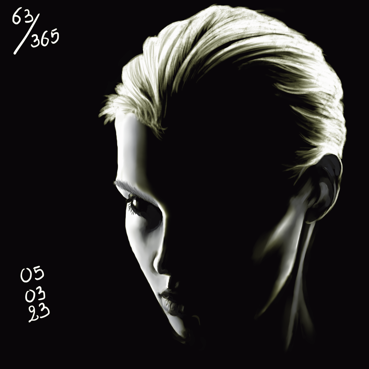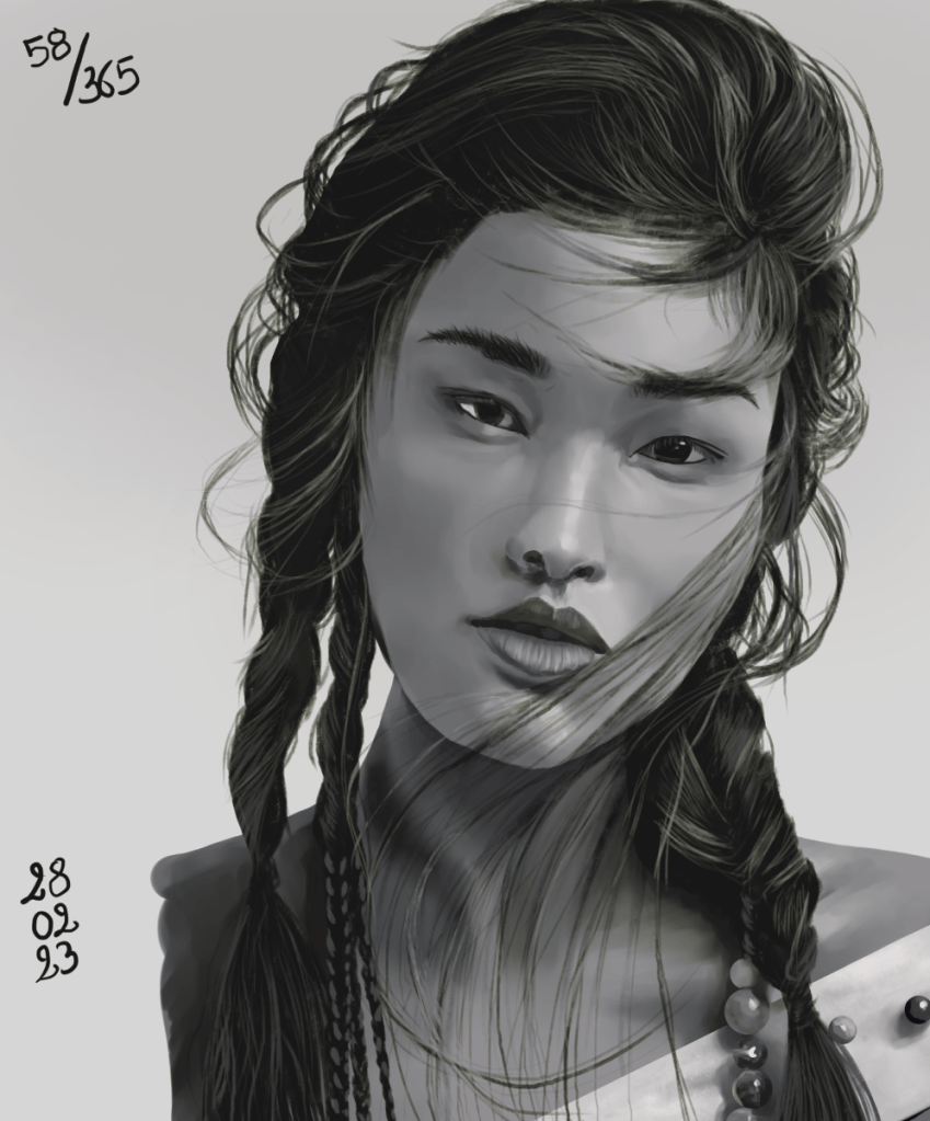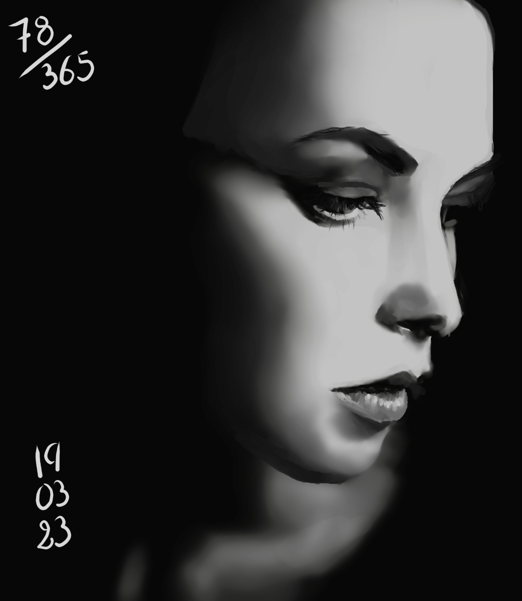 Rappel: Cette année, je participe au challenge 365 visages. Une étude de portrait par jour, tous les jours de l’année. Il existe des tas de groupes ou de propositions pour réaliser ce challenge. Quant à moi, puisque j’ai repris les cours, j’ai décidé de joindre celui proposé sur Digital Painting School, avec d’autres élèves. Le principe est simple: l’organisatrice du challenge nous donne une photo à étudier. On peut ne faire que le croquis, ou réaliser une étude en la peignant digitalement, ou à l’aquarelle, aux crayons de couleurs, aux feutres… Les possibilités sont infinies. Certains ont opté pour les croquis sur carnet, d’autres le font sur l’ordinateur… Certains s’essaient à la méthode de construction Loomis, d’autres essaient de faire sans, d’autres encore (et c’est mon cas) ont opté pour travailler en masses (pas de croquis, on applique les couleurs pour dessiner les volumes et les ombres, la lumière et on affine au fur et à mesure…). On peut se donner une limite de temps, ou profiter de cette expériences pour explorer les jeux de lumières, les valeurs, les teintes… bref, tout est possible. Les références alternent entre visages masculins et féminins, et sont très très variées: tous les ages, les ethnicités, en couleurs, en noir et blanc, voire même des peintures de maitres… un véritable régal, ce challenge!