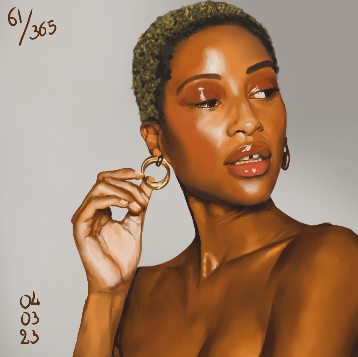 J’ai fait une pause après le précédent et je me suis lancée dans l’étude suivante.. et 2h 38 pour celui-ci, et pourtant, des vêtements, des cheveux, une lumière particulière, une oreille… mais je ne sais pas, je devais avoir la bonne playlist dans les oreilles hahaha. J’ai vraiment beaucoup aimé le peindre, en n’hésitant pas non plus à utiliser des couleurs particulières pour les cheveux, parce que la référence l’exigeait (et donc oui, le vert, c’est normal, cerveau, ça dépend de la lumière… ). C’est drôle, la veille, je n’arrivais à rien, et là, j’avais l’impression d’avoir passé un palier… encore un mystère mystérieux!