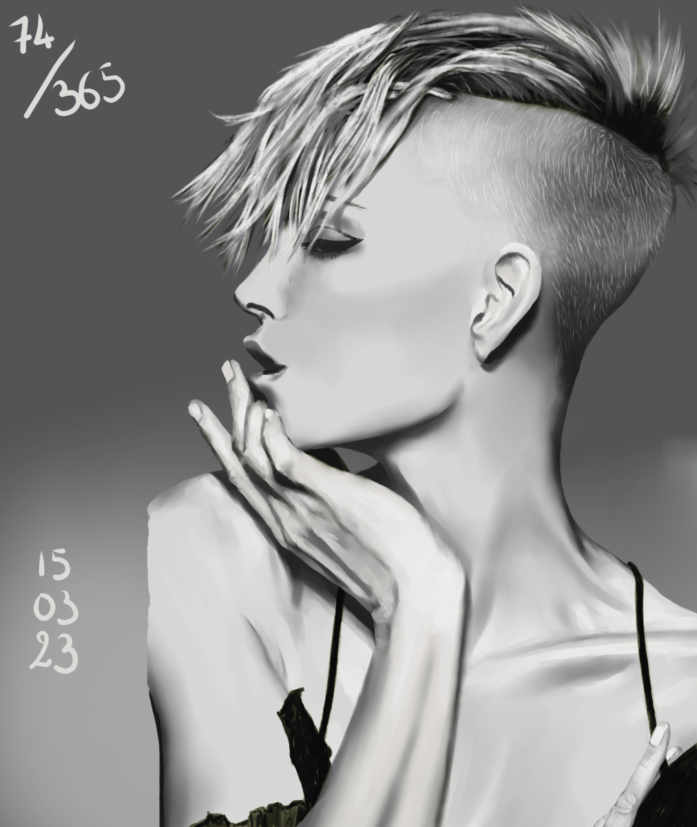 Aujourd’hui, j’avais besoin d’intensité, de force, et j’ai choisi cette référence pour ce qu’elle émanait. Si on ajoute une bande sonore adéquate et le tonnerre qui gronde dehors, vous avez une bonne idée de ce que ça donnait hahaha. Je n’ai pas utilisé mon brush habituel pour lui, mais celui plus structuré, justement pour ajouter encore un peu de rugosité à tout ça… Je suis plutôt très contente de ce que j’ai été capable de faire. Et en un temps record: 1h14!