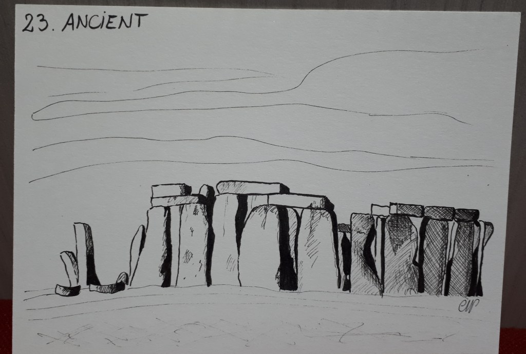 Après 6h de route, occupées la plupart du temps à gérer un enfant de 5 ans qui ne m’appartient pas (mais qui m’a été confié, rassurez-vous) enfermé dans une voiture, une installation et une balade pour se dégourdir les jambes, j’avoue que je suis drainée… MAIS j’ai quand même réussi à gribouiller quelque chose. Pas ma plus grande oeuvre, mais qui représente bien ce que ce mot m’inspire (c’est à dire pas grand chose, là tout de suite). mais je ne lache rien, j’irai au bout du challenge!! Demain devrait être plus propice aux gribouillages!