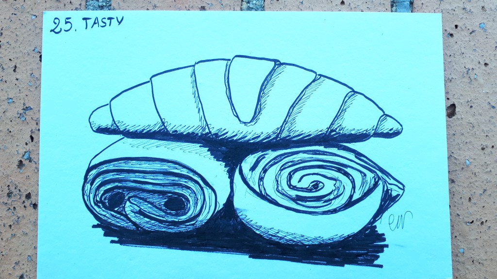 Ma première idée, une salade de fruits. Mais après plusieurs tentatives malheureuses, je commençais à désespérer…. Et puis on m’a amener un pain au chocolat pour le petit dej…. l’inspiration est revenue! Toujours aussi peu convaincue de mes capacités à représenter quoi que ce soit en noir et blanc, j’aurais au moins essayé! Mais pfiou…..