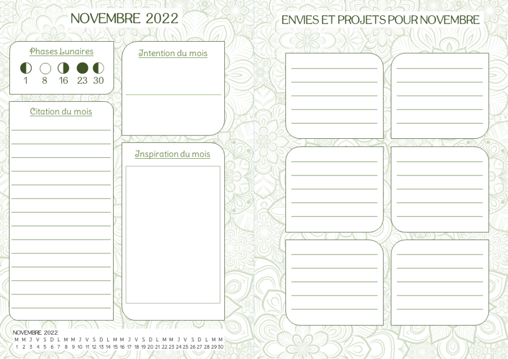 des pages mensuelles, avec une page de garde pour vos projets, un calendrier, les cycles lunaires et les petits extras,