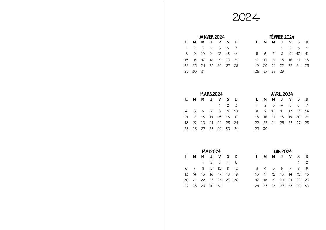 Mais du coup, je dois m’organiser, pour éviter de me submerger de trucs et/ou de m’éparpiller. Et c’est pour ça que j’ai créé mon agenda pour cette année 2024. Parce qu’évidemment, je n’ai pas trouvé ce que je voulais…. je sais, je sais….