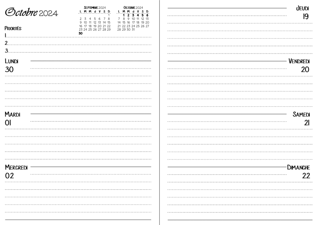 les pages hebdomadaires, avec à droite une semaine par page, et à gauche une page pour vous permettre de faire le bilan de votre semaine, ou écrire ce que bon vous semble.