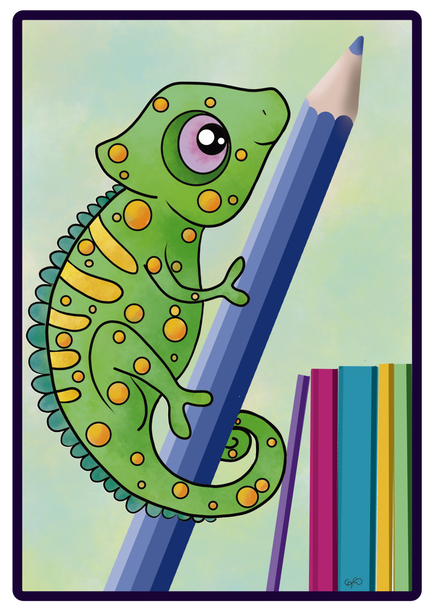 Je me suis plongé dans ce projet qui me réconciliait, en quelque sorte, avec ces 15 dernières années. j’ai pris beaucoup de plaisir à créer chaque illustration, en essayant de rester la plus simple possible, toujours, et en dessinant un caméléon différent à chaque fois. Inutile de chercher le réalisme, je partais plus sur quelque chose d’accessible et d’attrayant pour des enfants de maternelle ou de cycle 2. Et j’étais forte de mon expérience de prof des écoles en CP/CE1 pendant plus d’une décennie… je savais quoi faire, je savais ce qui leur plaisir, et je savais comment le faire…