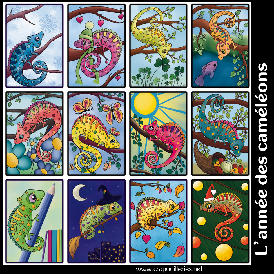 J’ai donc attrapé ma tablette à nouveau, et j’ai créé l’année des caméléon, chaque mois étant illustré de l’adorable bestiole, avec un thème particulier à chaque fois, quelque chose qui serait surement travaillé en classe…