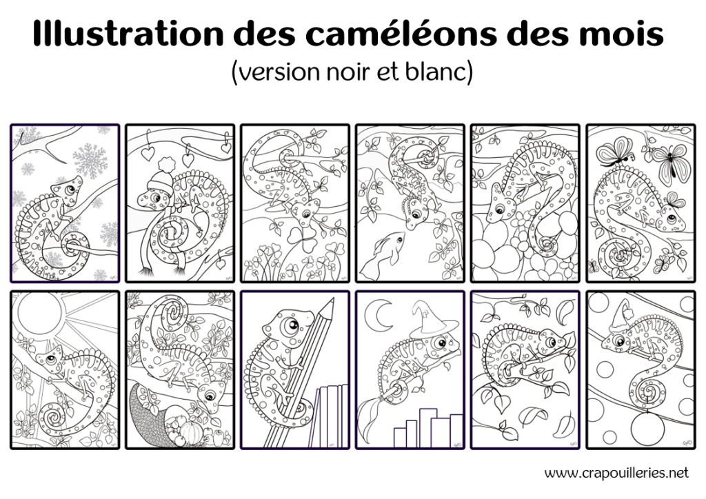 Bref, je me suis retrouvée avec une nouvelle obsession à assouvir… Au cours d’une autre de nos conversations, elle me dit qu’elle aimerait bien trouver un affichage des mois illustré de caméléons, mais qu’elle n’en avait pas encore trouvé… Qui étais-je pour la laisser dans l’embarras???