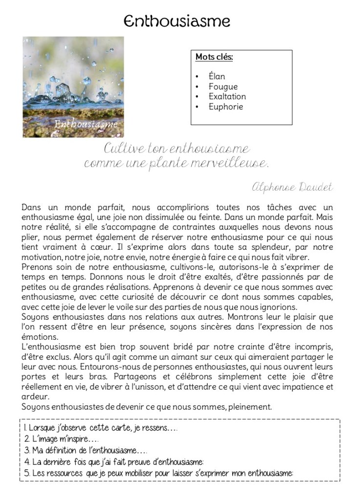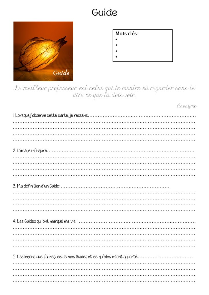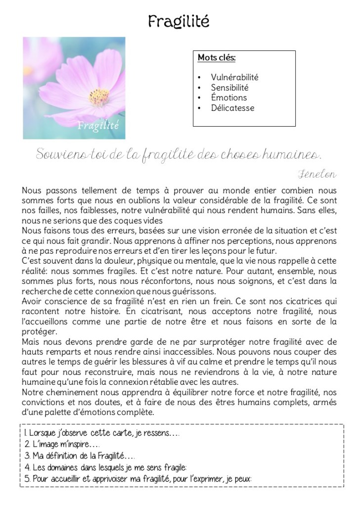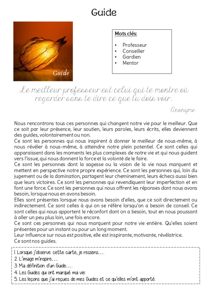 ps: La tristesse était la dernière carte un peu compliquée émotionnellement, notre voyage s’achèvera sur des notes plus légères. Il ne nous reste qu’une semaine à voyager ensemble. J’espère que votre voyage est aussi enrichissant que le mien l’est pour moi. A la fin du voyage, pour ceux qui le désire, je vous proposerai le jeu des cartes du voyage intérieur à imprimer. Je suis en train de voir pour vous proposer un « véritable » jeu, que vous pourrez acquérir directement.