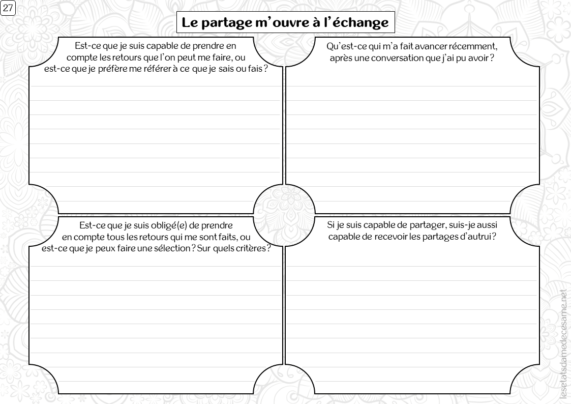 Ce cheminement, comme les précédents, est constitué d’une carte par jour, et d’un guide, que vous pouvez trouver ici. Chaque jour, je vous partage des extraits du guide, sous la forme de pistes d’actions, et d’une fiche avec des questions pour vous permettre de cheminer (je suis plutôt contente du nouveau format des fiches, j’espère qu’il vous plaira également!). À la fin du cheminement, les fiches seront transférées dans deux documents pdf que vous retrouverez sur la même page que les cartes et le guide.